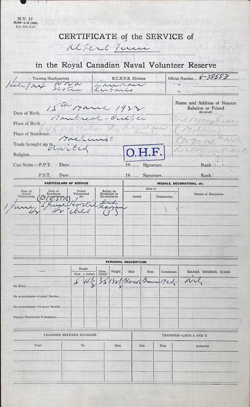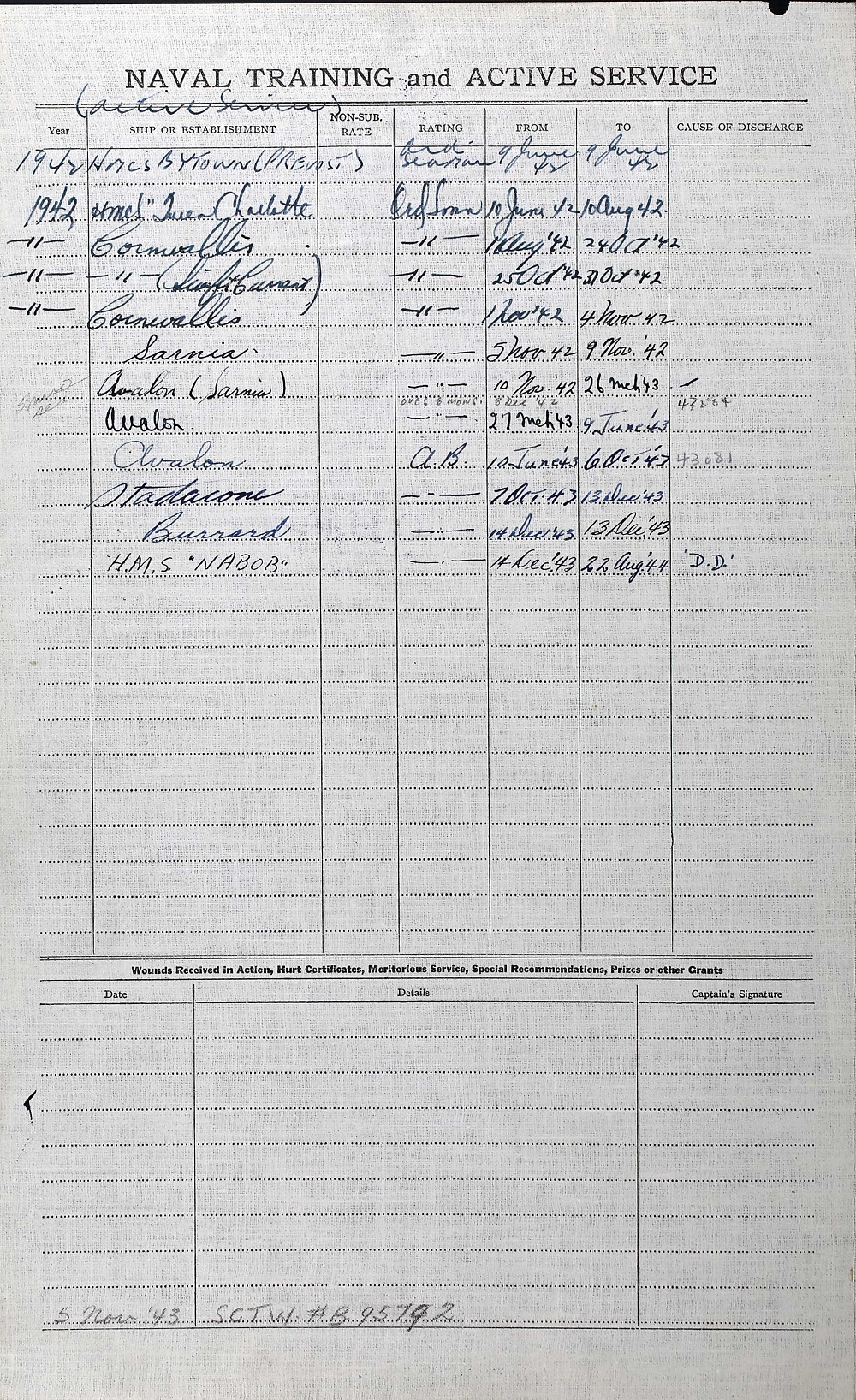 Ships served in: HMCS PREVOST - Enlisted 09 Jun 1942 HMCS SWIFT CURRENT - Served in Swift Current 25 Oct 1942 - 31 Oct 1942 while in training at HMCS Cornwallis HMCS SARNIA - Served in Sarnia 10 Nov 1942 - 26 Mar 1943 as an OS, RCNVR HMS NABOB - Drafted to Nabob 14 Dec 1943 as an AB, RCNVR