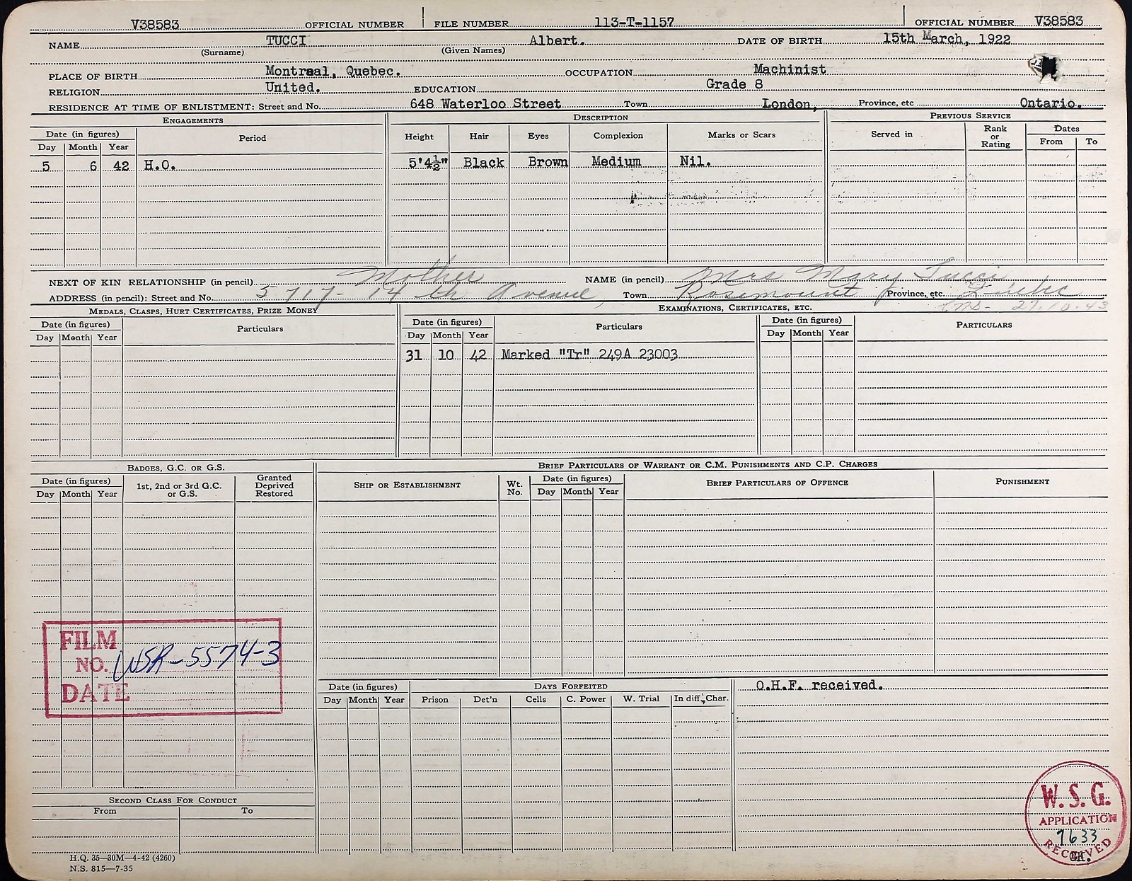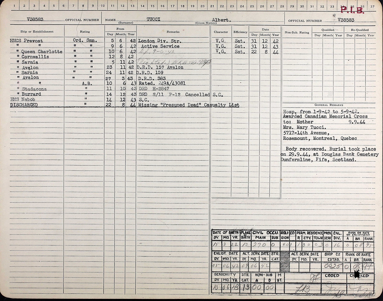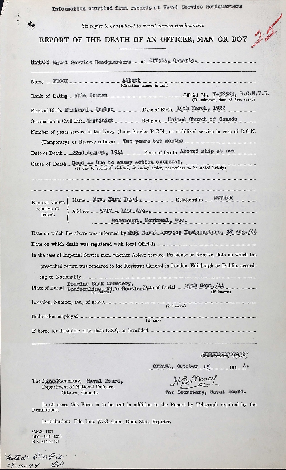 TUCCI, Albert, AB, V38583, RCNVR, killed - 22 Aug 1944, HMS NABOB - son of John and Mary Tucci, of Montreal, QC.