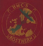 (WE01) William (Bill) Easton with his younger brother Robert (Bob) Easton (WE02) Cloth print of an HMCS ROSTHERN badge. There is a similar version of this badge used for a jacket patch - but there is no confirmed use of this as gunshield or bridge art.