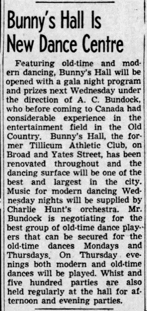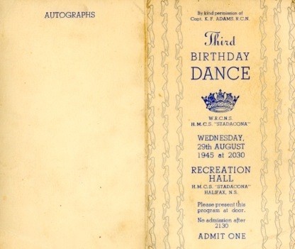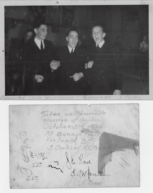 (JL11) Depth charge exploding - ship unknown (JL12-JL13) Program for the W.R.C.N.S. Third Birthday Dance, HMCS Stadacona, Wed, 29 Aug 1945 (JL14) “Taken on Memorable Ocassion (sic) of Payday October 31st 1939 at Bunny’s Hall Victoria BC 3 Cooks of RCN on a bender.” signed JE Lowe, EA Morrison, N. Symonds (JL15) Newspaper article on Bunny's Dance Hall - the former Tillicum Athletic Club, Victoria, BC