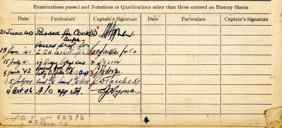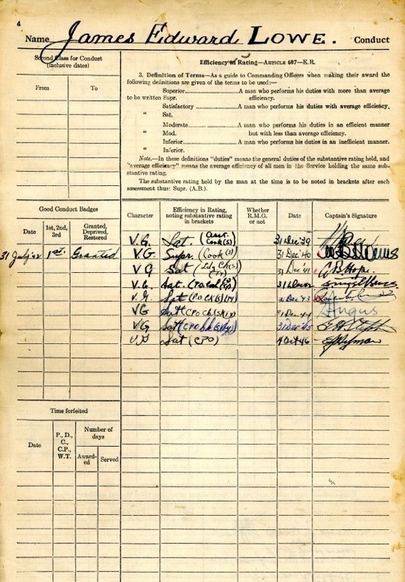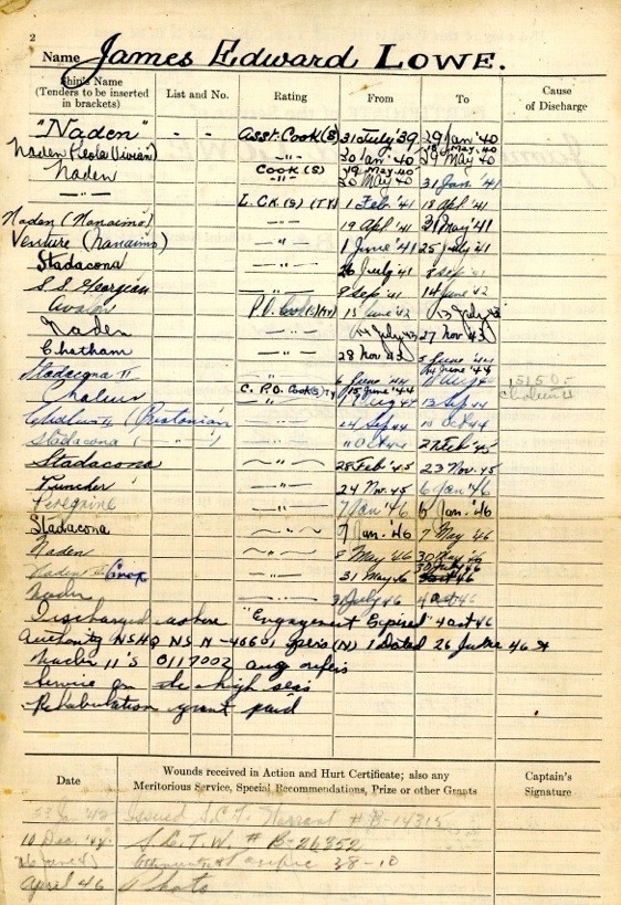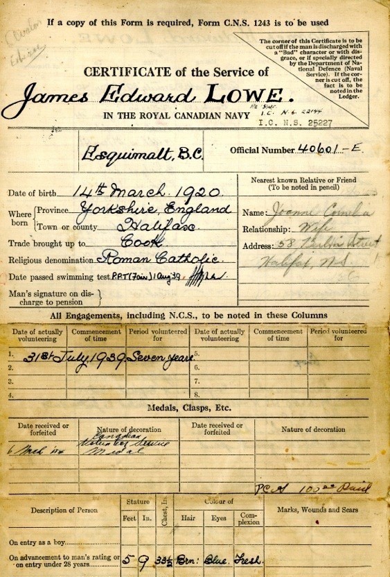 Ships served in: HMCS LEOLA VIVIAN - Served in Leola Vivian - 30 Jan 1940 - 29 May 1940 as A/Cook (S) and Cook (S), RCN S.S. GEORGIAN HMCS NANAIMO - Served in Nanaimo 19 Apr 1941 - 25 Jul 1941 as a L/Ck (S), RCN HMCS CHALEUR - Served in Chaleur 19 Aug 1944 - 13 Sep 1944 as a CPO.Ck (S), RCN HMCS PRESTONIAN - Served in Prestonian 14 Sep 1944 - 27 Feb 1945 as a CPO.Ck (S), RCN HMS PUNCHER - Served in Puncher 27 Nov 1945 - 06 Jan 1946 as a CPO.Ck (S), RCN