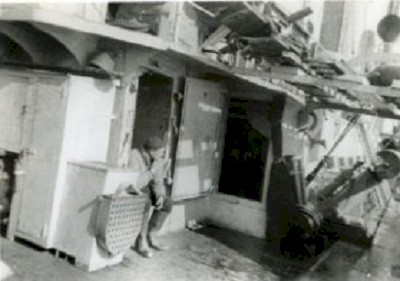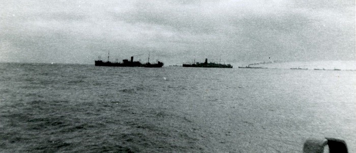 (JL06) Unknown ships at Scapa Flow, March 1944 (JL07) Some RCN cooks - date and place unknown. James E. Lowe back from 1st on right (JL08) Atlantic Convoy - 1944 (JL09) Sailor on the deck of unknown ship (JL10) Depth charge being dropped - ship unknown