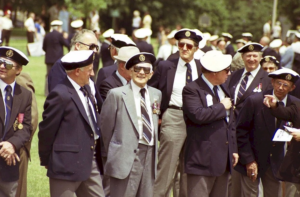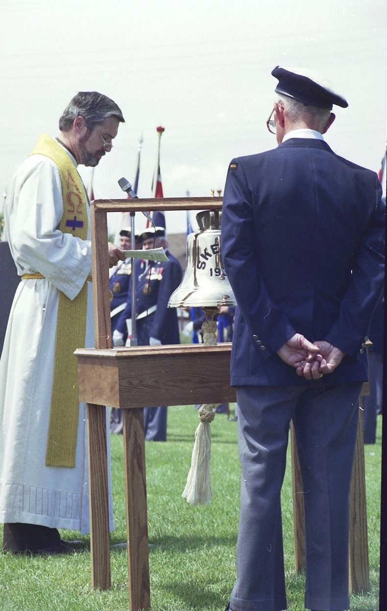(WB87) Article on 5 survivors from HMCS SKEENA - Sto Harold French, AB Wilbert Brown, L/SA Stewart McRae, Sto Joseph Bell and LS W. Belling (WB88) William Belling at the rededication of the bell from HMCS SKEENA (1st of name) in Burlington Ontario circa 1983. Photographer Kevin Lee (WB89) William Belling at the rededication of the bell from HMCS SKEENA (1st of name). William Belling is wearing light grey jacket. Photographer Kevin Lee