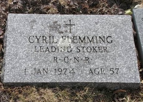Husband of Ellen C. Flemming; father of Mary Maureen (James) Slaunwhite. Cyril is buried in the Mount Calvary Cemetery, Ketch Harbour, NS.