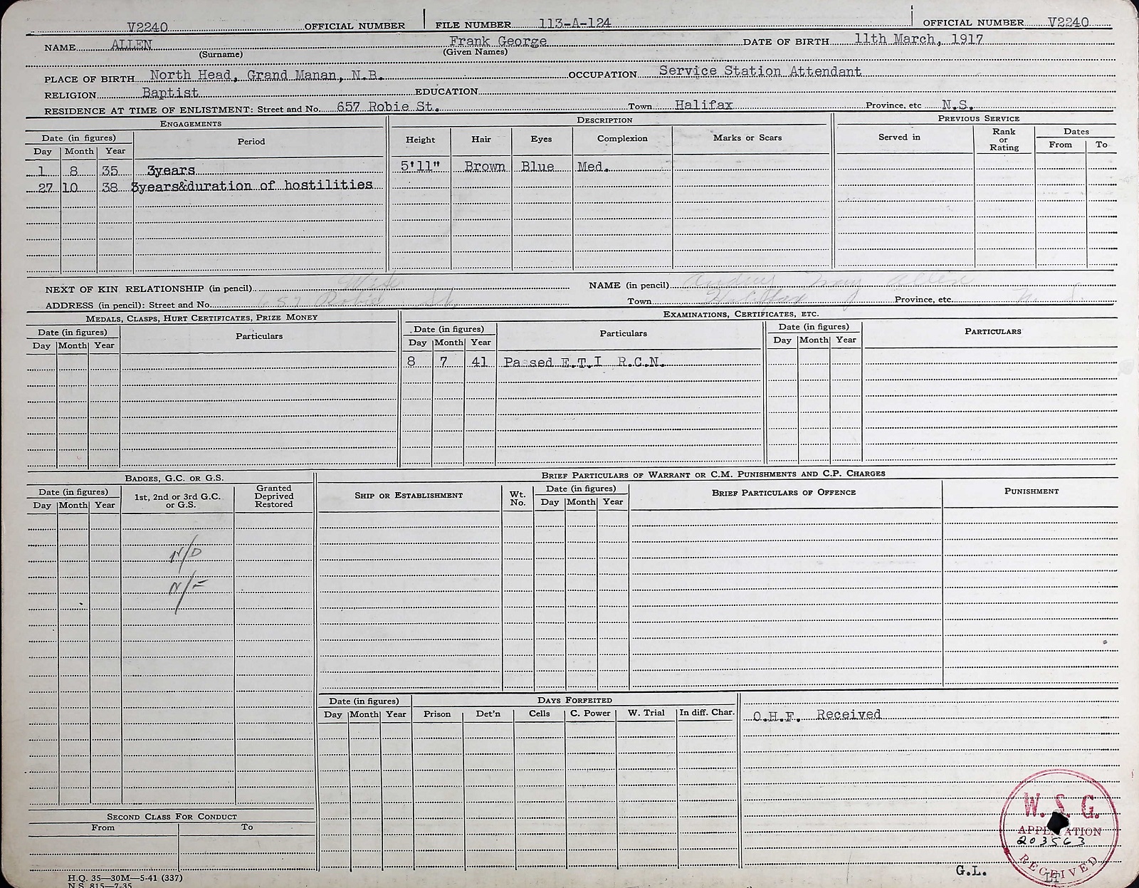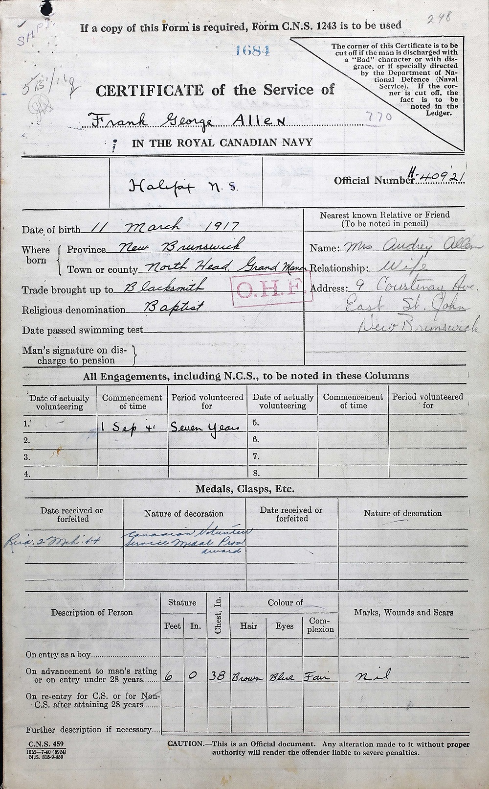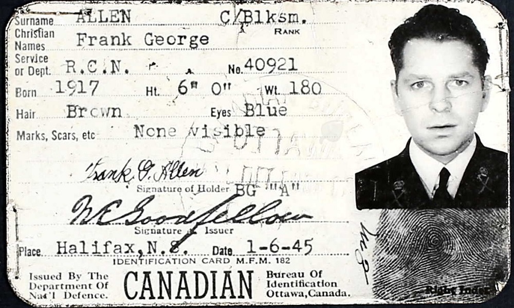 Frank Allen joined the RCNVR (service # V2240) on 01 Aug 1935 at Saint John, NB. He transferred to the RCN on 01 Sep 1941. He died when the taxi he was in drove off the end of Jetty 3 in HMC Dockyard. The taxi driver managed to escape the vehicle but Frank Allen and his shipmate James Lambert, who was in the taxi with him, both drowned. He is buried in the St. George's Parish Cemetery, Parrsboro, NS.