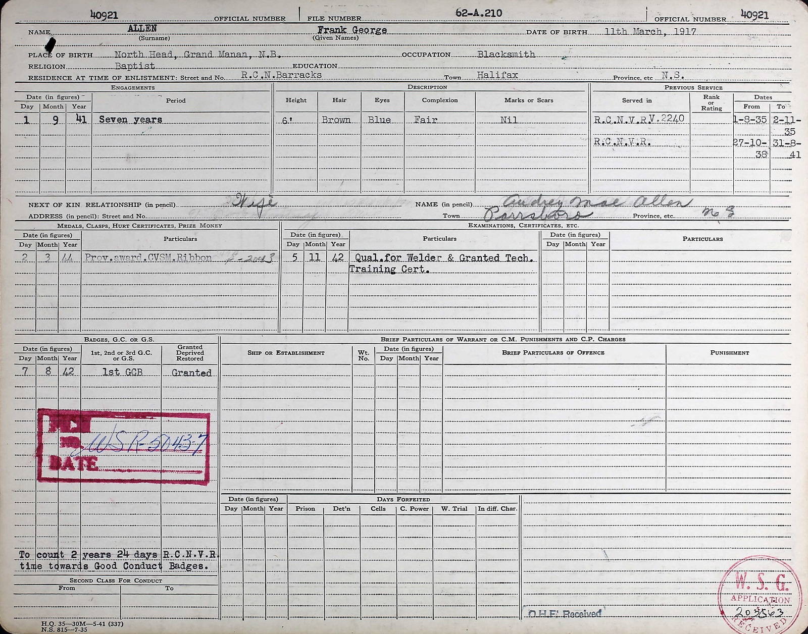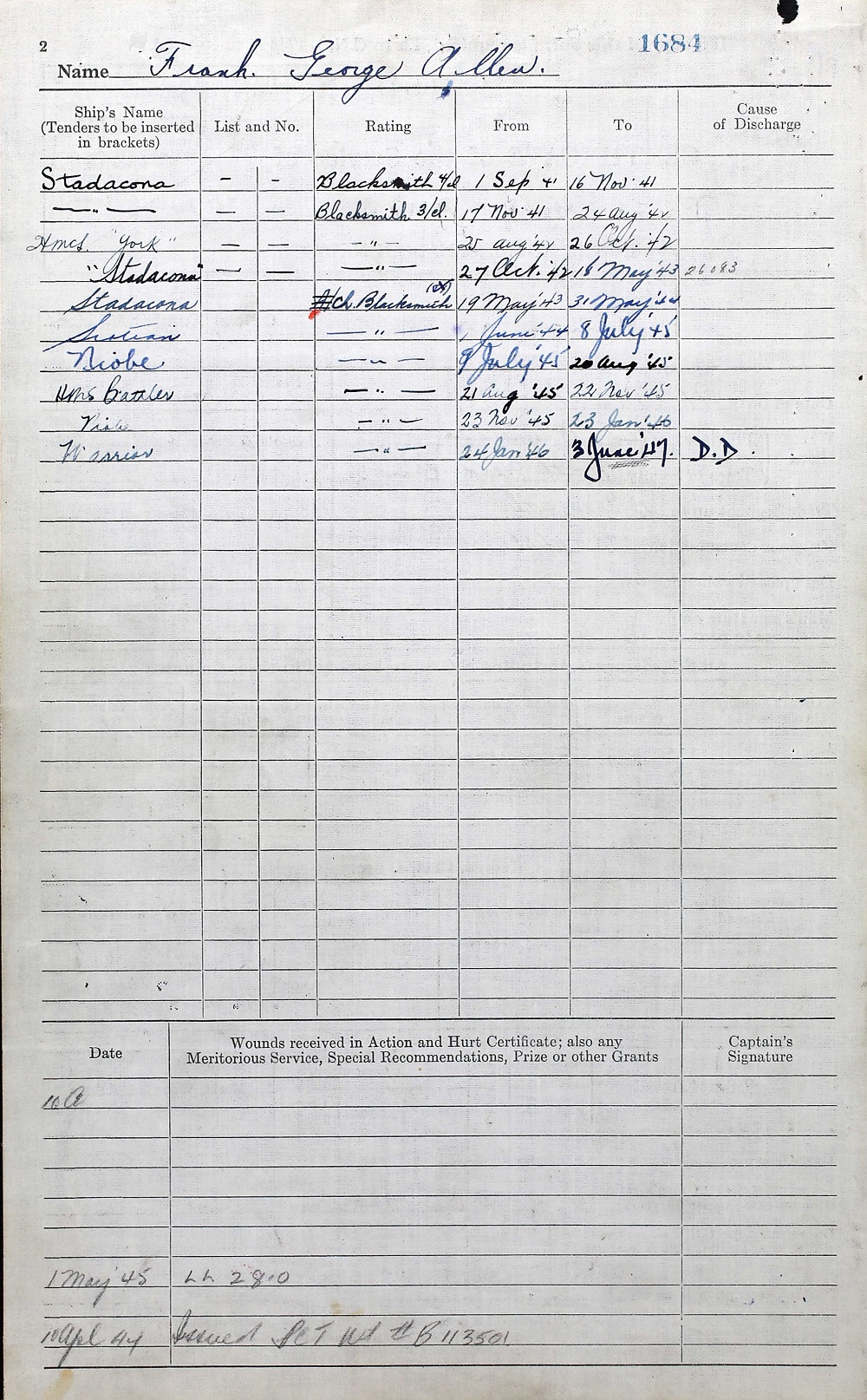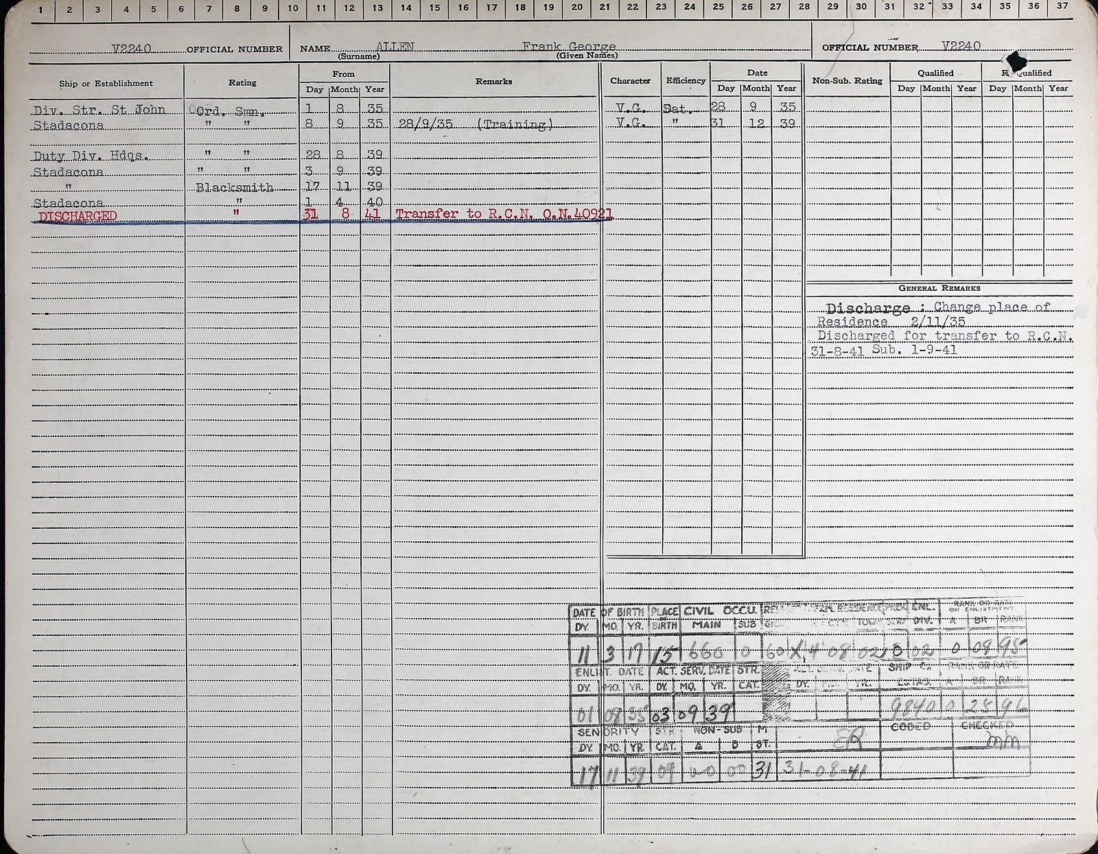 ALLEN, Frank George, Chief Blacksmith, 40921H, RCN, died - 03 Jun 1947, HMCS WARRIOR - son of Frank H. Allen and Loretta L. Allen, of East Saint John, NB; husband of Audrey Mae Allen, of Parrsboro.
