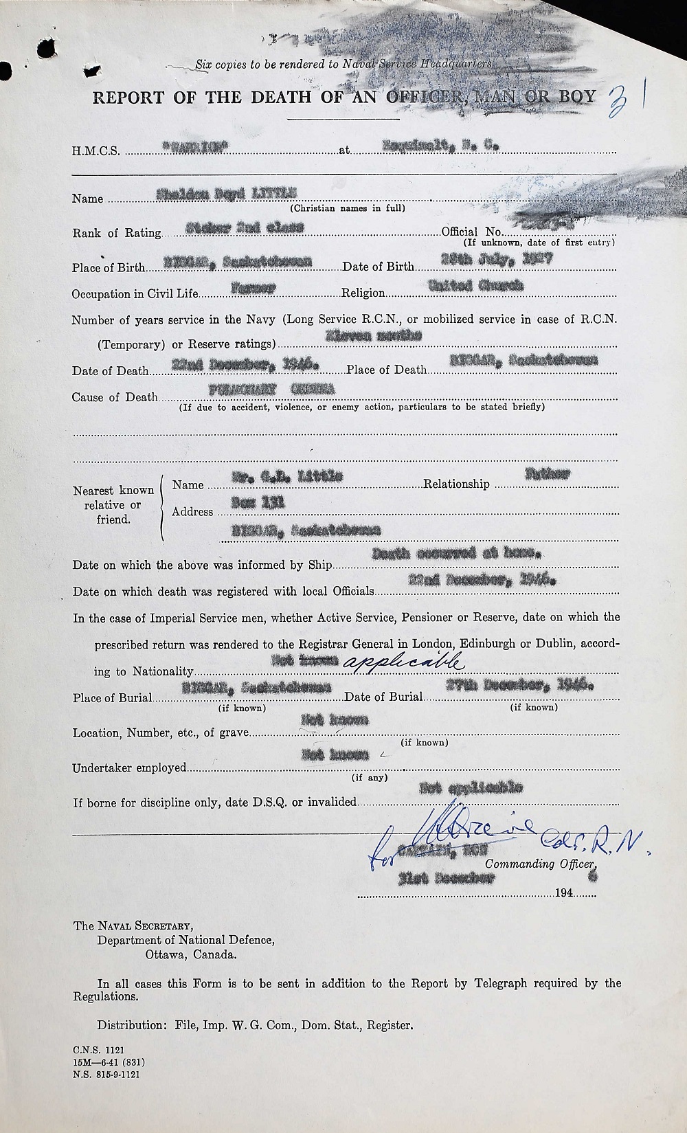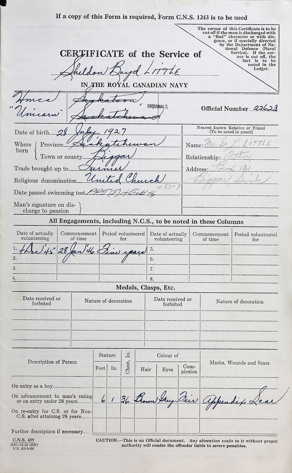 Sheldon Little was farming with his family when he enlisted on January 28, 1946 at HMCS Unicorn, Saskatoon, SK. He died at Biggar Hospital, Biggar, SK of pulmonary oedema while home on leave.