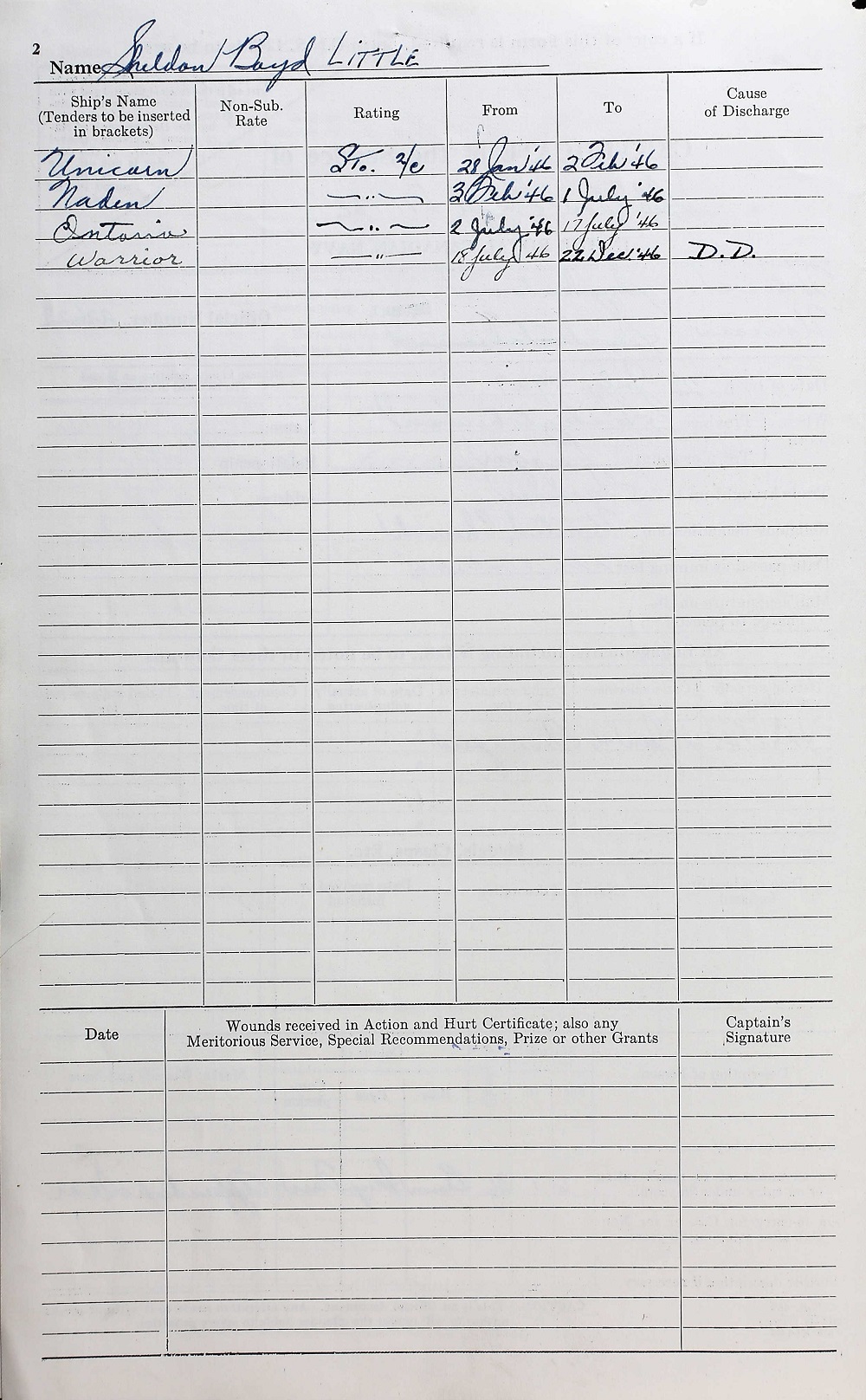 Ships served in: HMCS UNICORN - Enlisted 28 Jan 1946 HMCS ONTARIO - Served in Ontario 02 Jul 1946 - 17 Jul 1947 as a Sto 2c, RCN HMCS WARRIOR - Drafted to Warrior 18 Jul 1947 as a Sto 2c, RCN