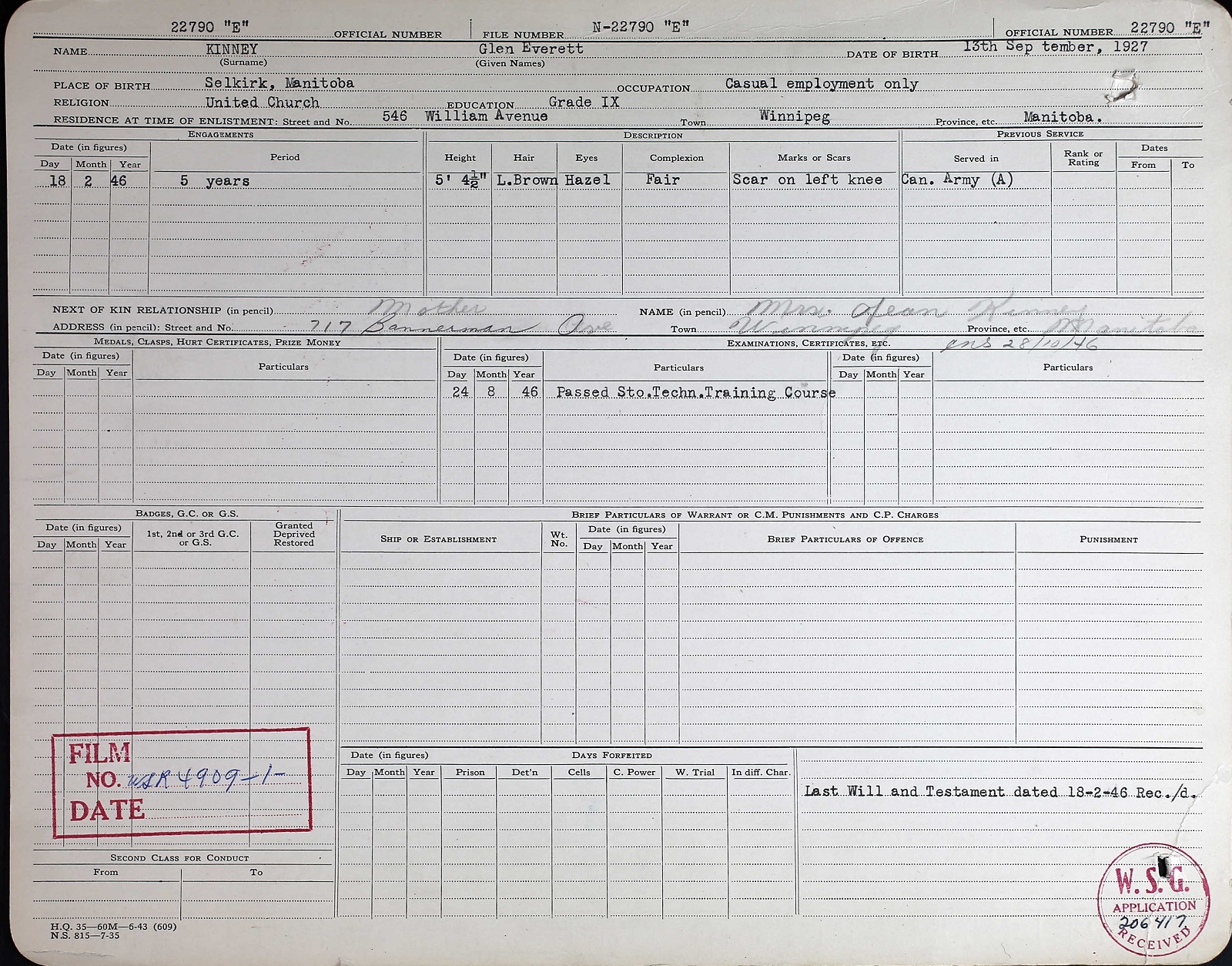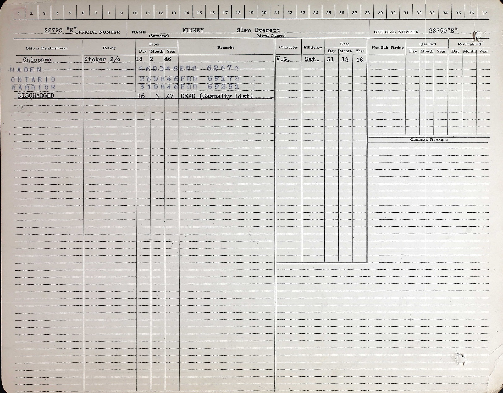 Ships served in: HMCS CHIPPAWA - Enlisted 18 Feb 1946 HMCS ONTARIO - Served in Ontario 26 Aug 1946 - 30 Aug 1946 as a Sto 2c, RCN HMCS WARRIOR - Drafted to Warrior 31 Aug 1946 as a Sto 2c, RCN