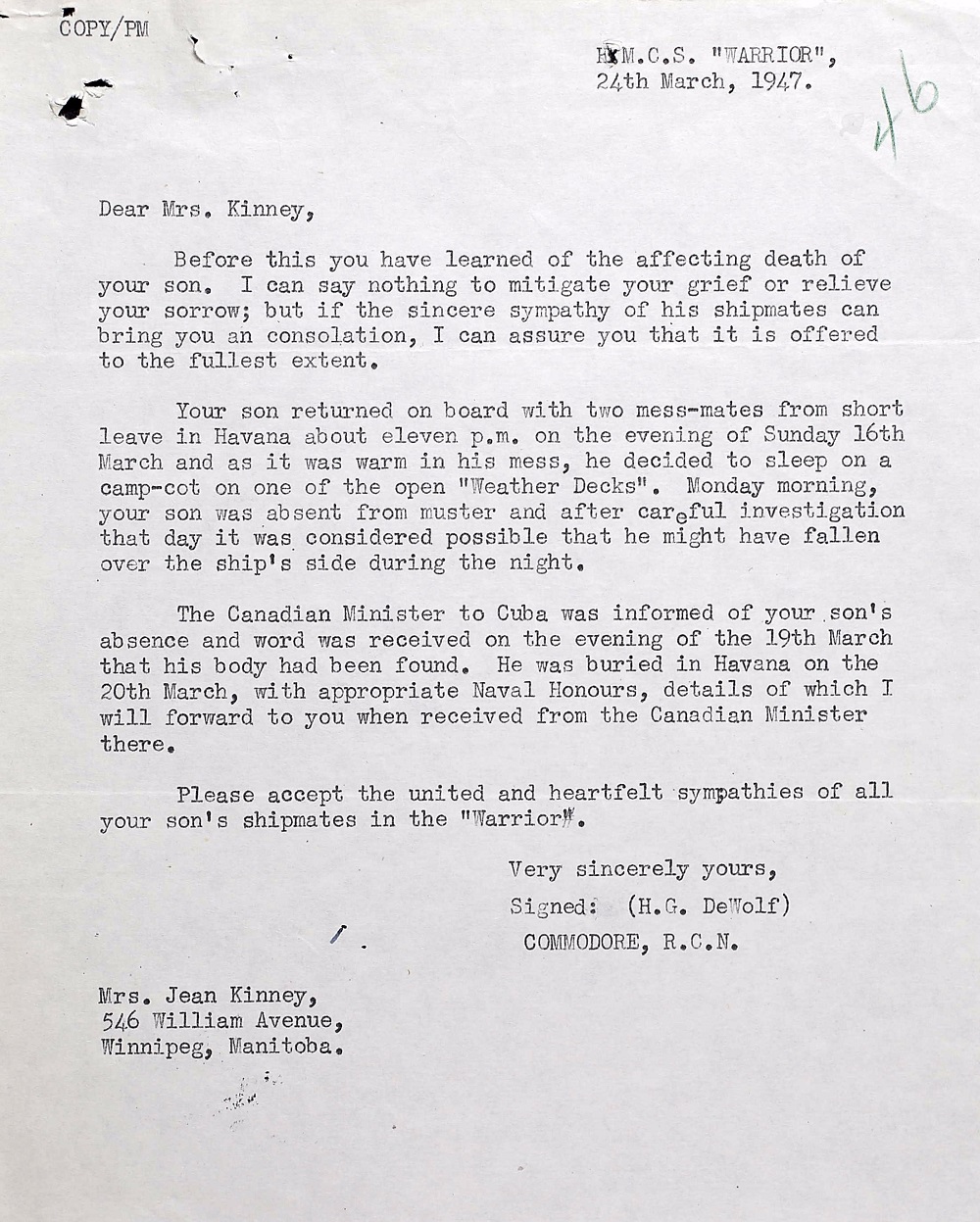 Stoker Kinney was found to be missing after he failed to report for duty on the morning of March 17, 1947. He was last seen at approximately 23:30 hours the previous evening on his return to the ship after a short shore leave in Havana, Cuba. After conversing with ship mates, he proceeded to the hanger deck where he rigged his camp cot and turned in. Nothing further was seen of him from that time until his body was recovered from Havana Harbour on March 19, 1947; it is presumed that he fell overboard. He is buried in the Colon Cemetery, Haven, Cuba.