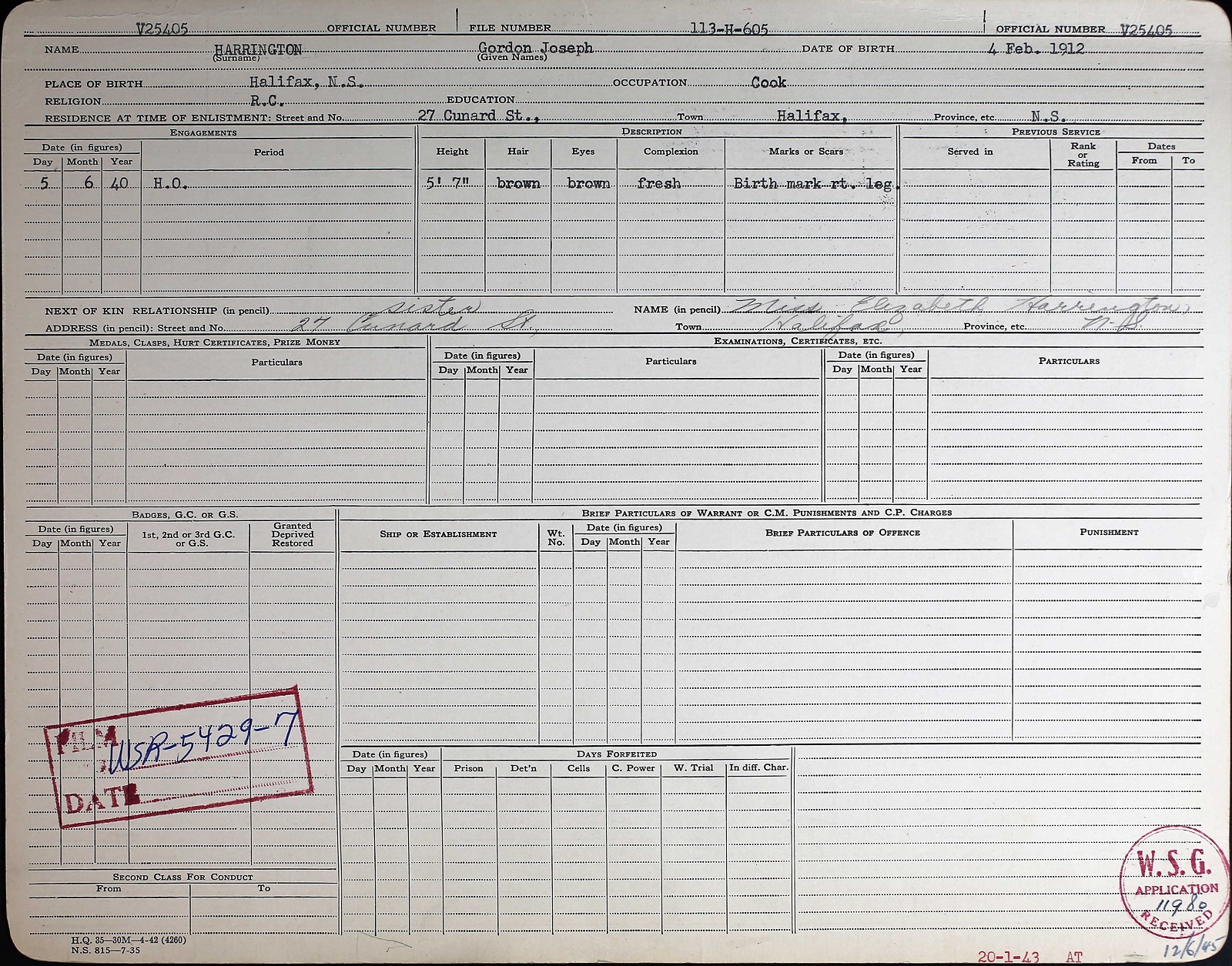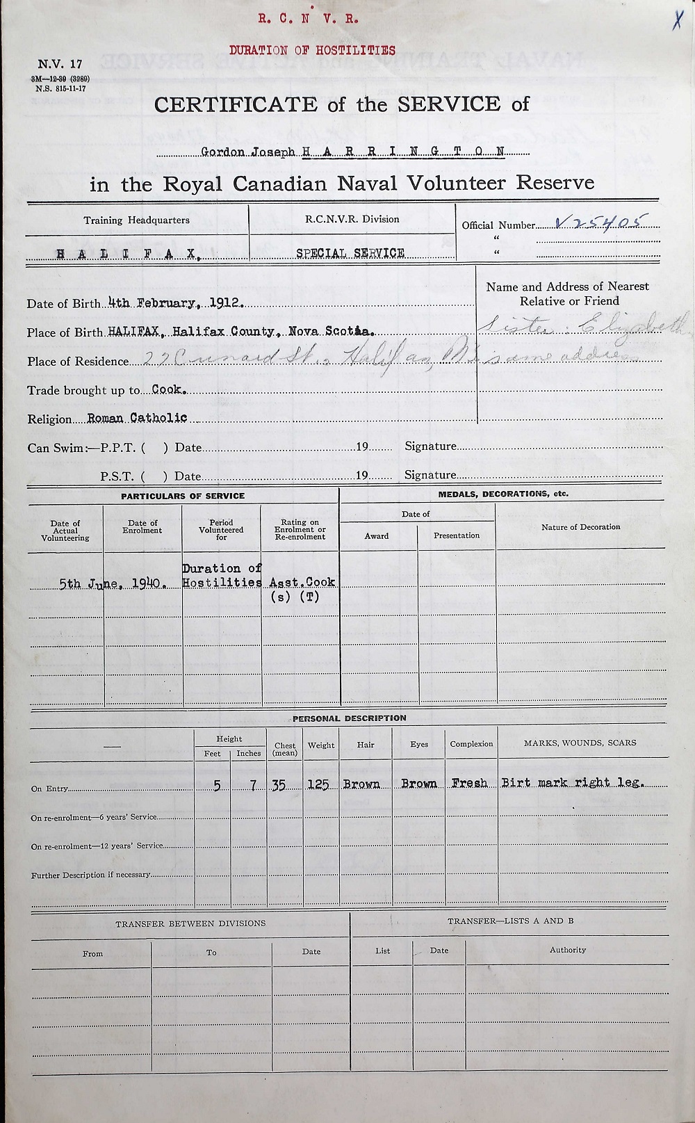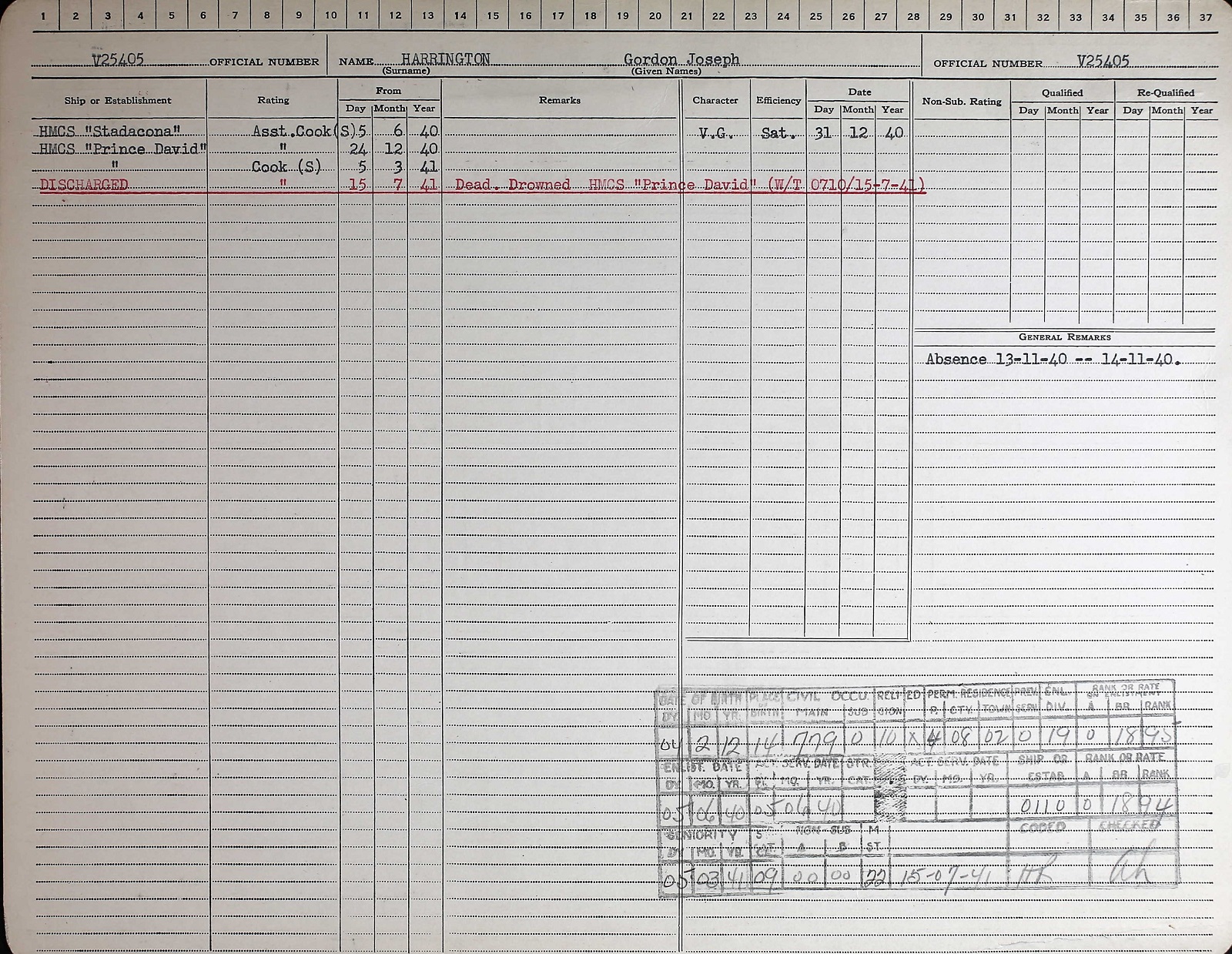 HARRINGTON, Gordon Joseph, Cook, V25405, RCNVR, died - 14 Jul 1941, HMCS PRINCE DAVID - son of Edward and Mary Bell Harrington. Brother of Elizabeth and grandson of Mary Harrington.
