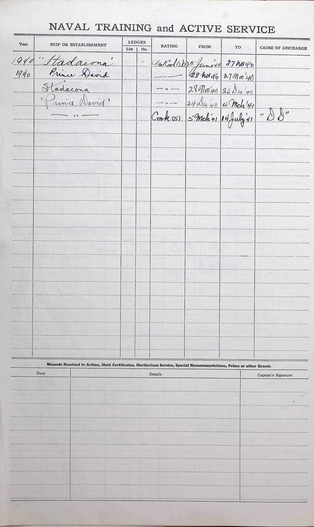 Ships served in: HMCS PRINCE DAVID - Drafted to Prince David 24 Dec 1940 as an Ass't Cook (S)(T), RCNVR. Rated Cook (S) on 05 Mar 1941