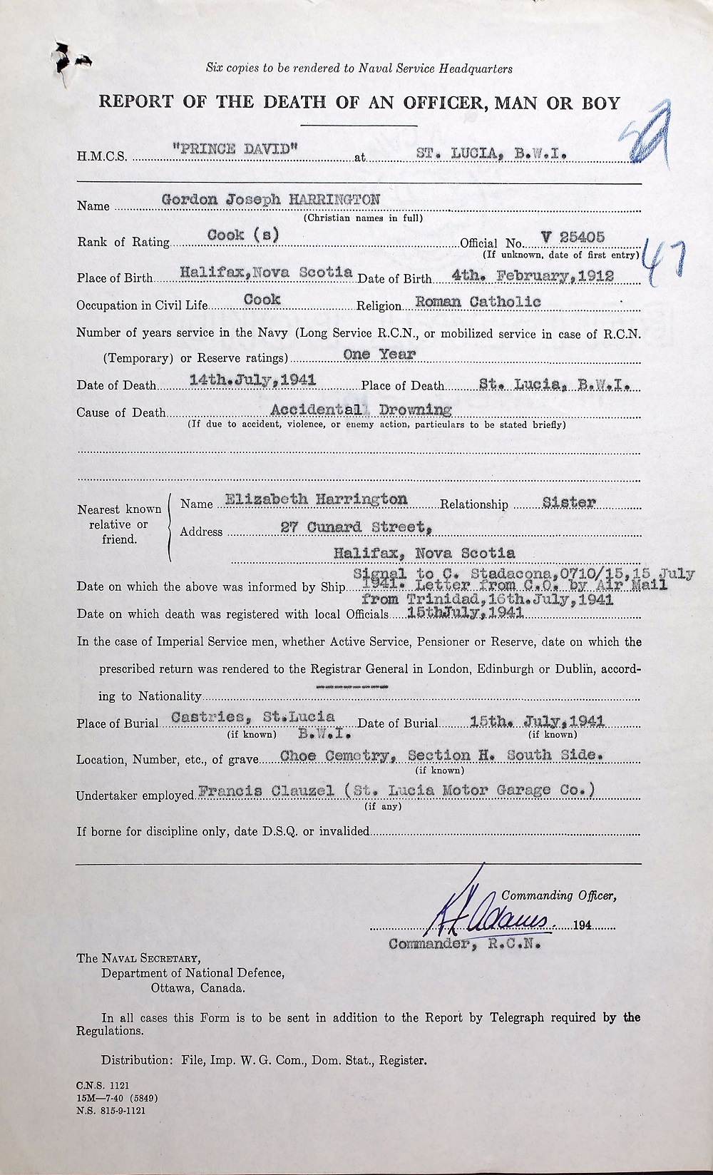 Cook G. J. Harrington died at St. Lucia, British West Indies from accidental drowning while serving in HMCS Prince David. He is buried in the Choc Bay War Cemetery, St. Lucia, British West Indies.