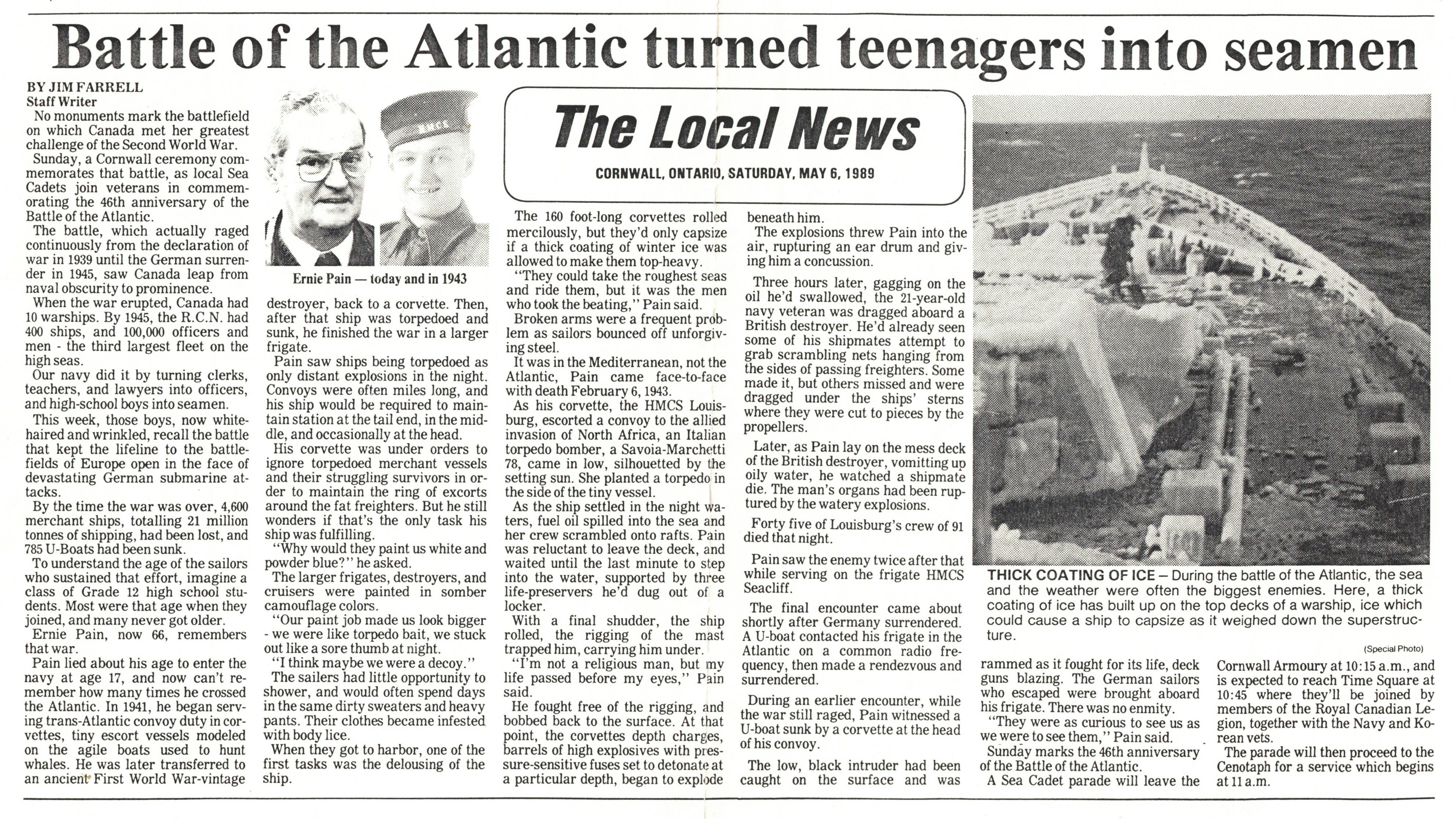 Ernest Pain remembered the Battle of the Atlantic Cornwall, Ontario, Saturday 06 May 1989 Click on the above article to view a larger image