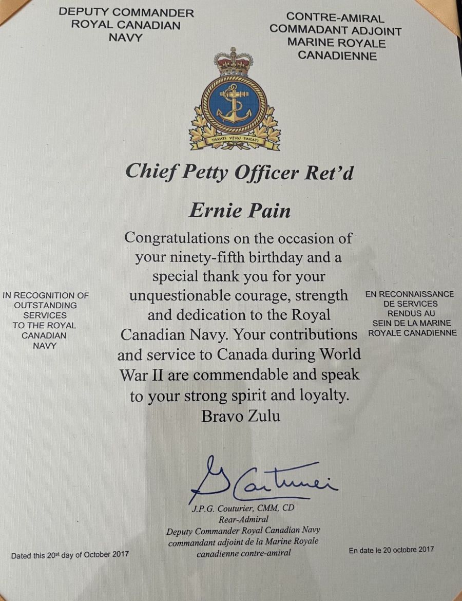 Congratulations to Ernest Pain on the occasion of his 95th birthday from the Deputy Commander, RCN