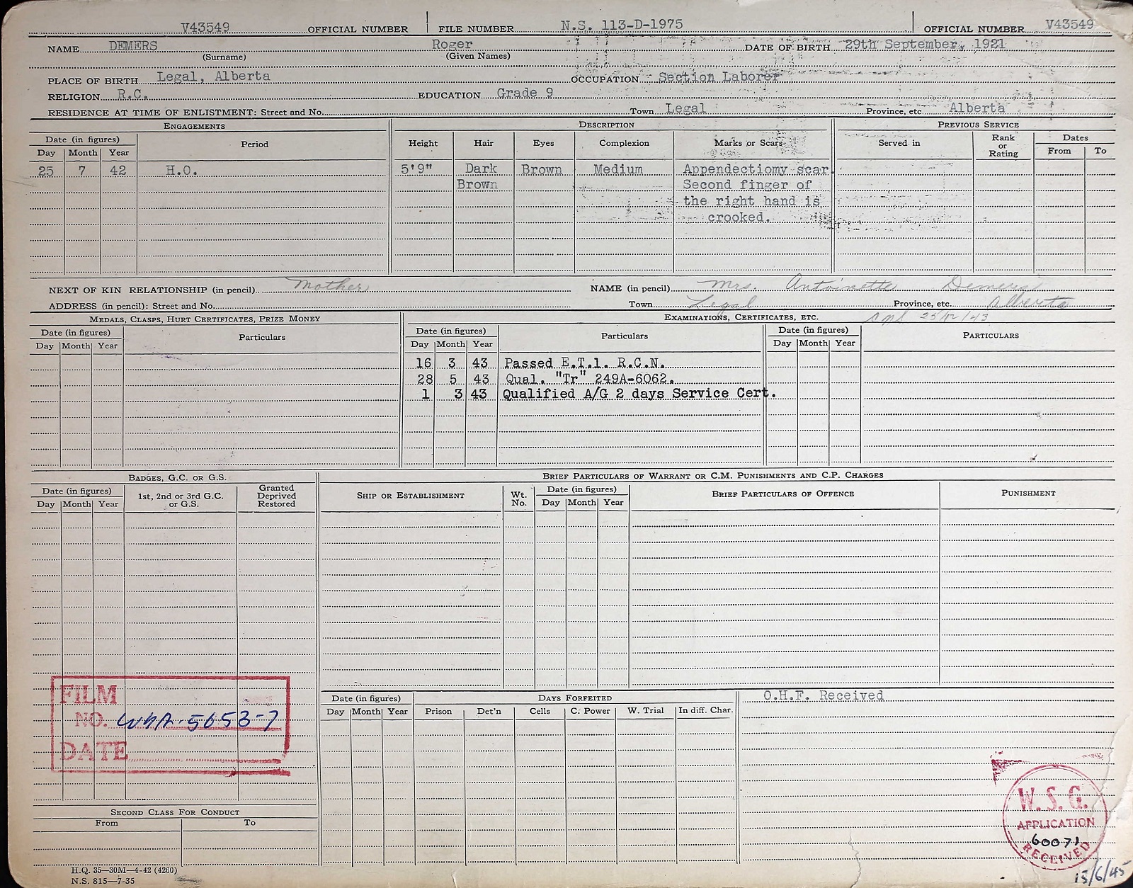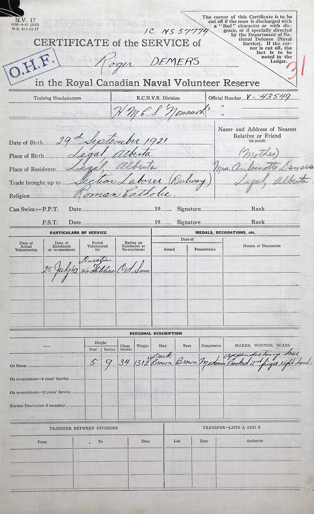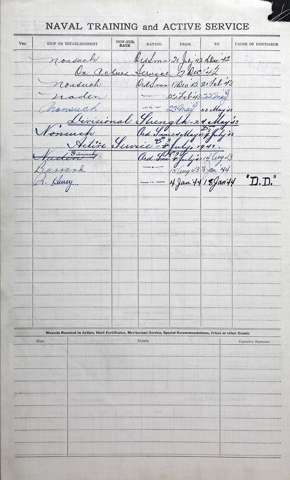 Ships served in: HMCS NONSUCH - Enlisted 25 Jul 1942 HMCS GIVENCHY - Served in GIVENCHY 09 Jul 1943 - 14 Aug 1943 as an OS, RCNVR HMCS PRINCE HENRY - Drafted to PRINCE HENRY 04 Jan 1944 as an OS, RCNVR