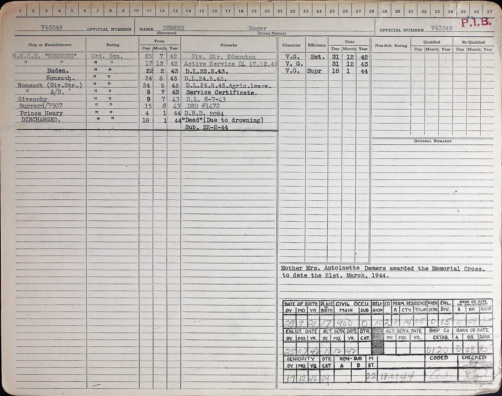 DEMERS, Roger, OS, V43549, RCNVR, died - 19 Jan 1944, HMCS PRINCE HENRY - Son of Joseph and Antoinette Demers, of AB.