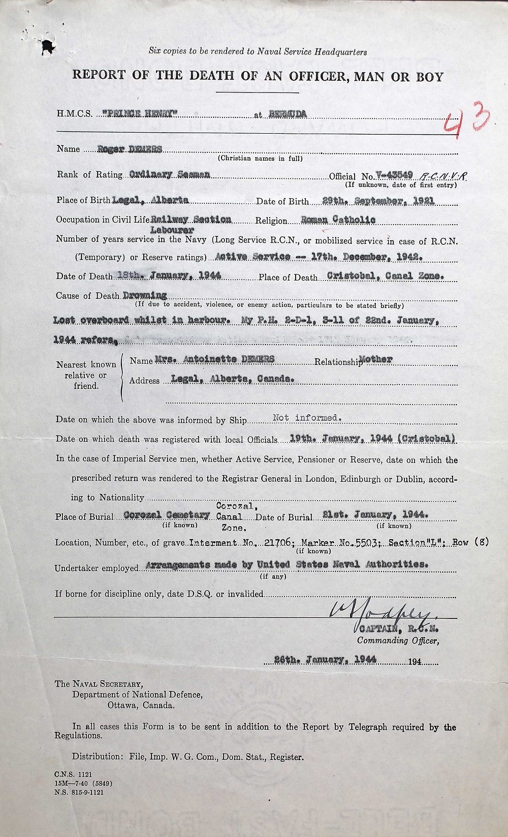 Ordinary Seaman Demers accidentally drowned at Cristobal, Canal Zone, Panama. He went ashore on a short leave and reported back to HMCS PRINCE HENRY at 10:30 pm. When the ships company assembled later in the morning next day Ordinary Seaman Demers absence was noticed and an extensive search was made immediately but without success. Roger Demers body was recovered from the dock at which the ship had been berthed on January 19, 1944. OS Demers is buried in the Corozal American Military Cemetery, Panama.