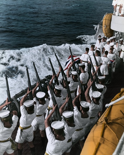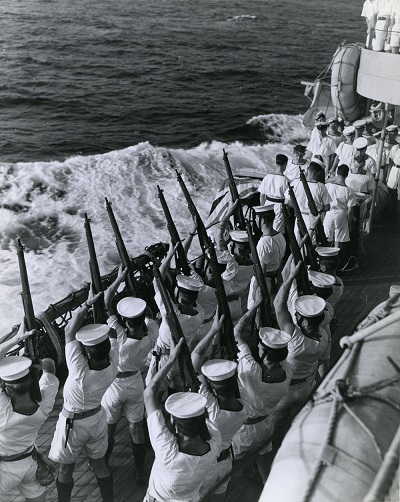 Burial at sea for Sto 1c, Stanley William Boehler, RCNVR Buried at sea on August 17th, 1943, HMCS Prince Robert, position 36 deg 58' N by 59 deg 01' W. Photograph taken by Herbert Nott Source: RCN official facebook page