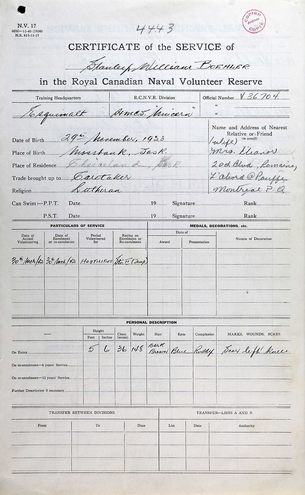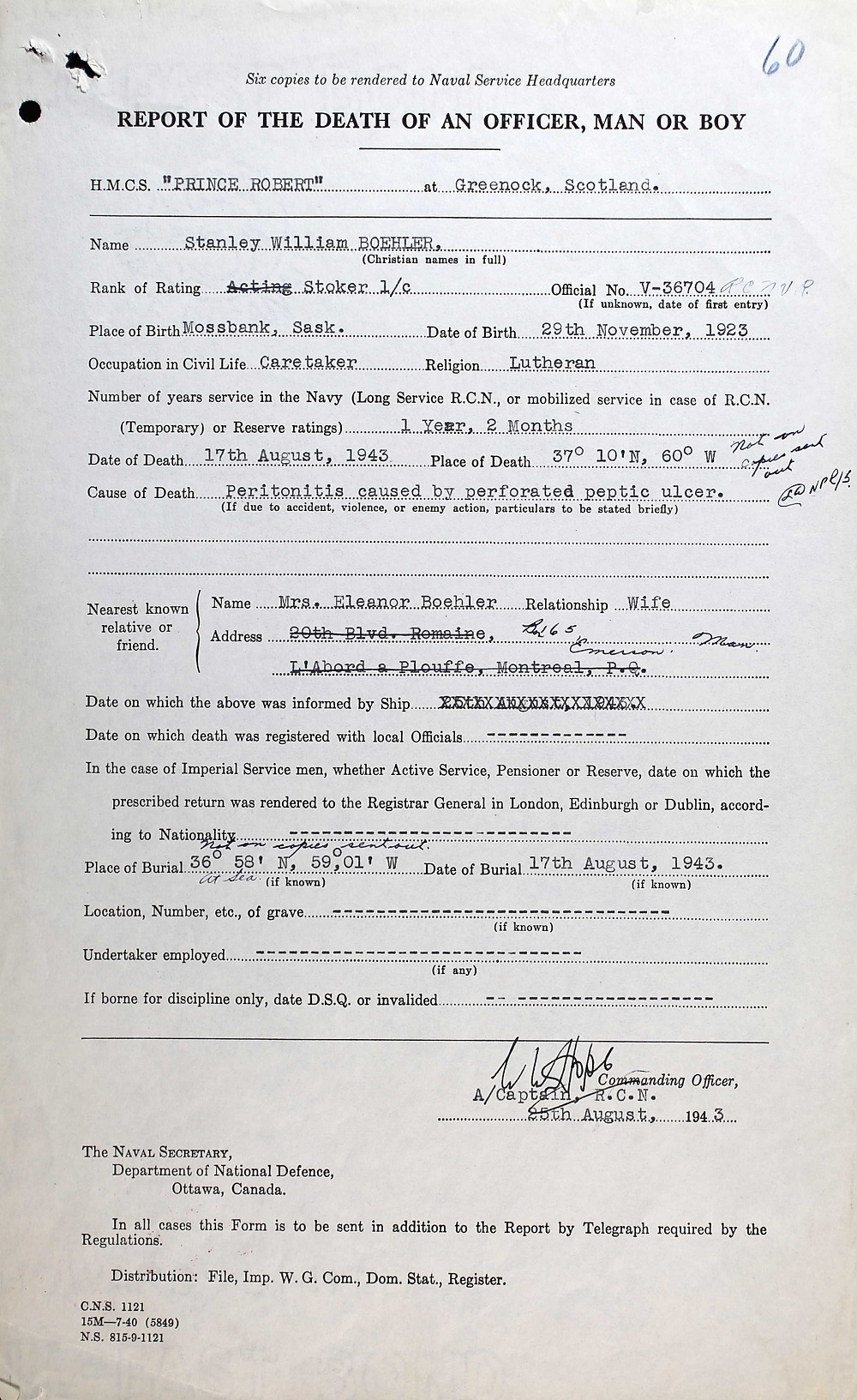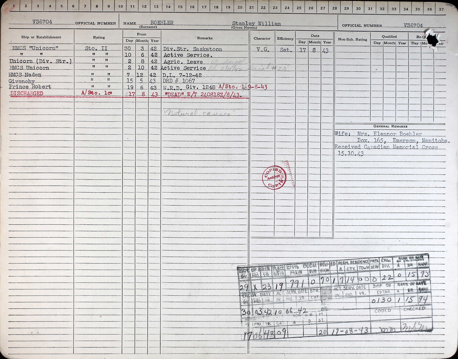 BOEHLER, Stanley William, Sto, V 36704, RCNVR, died - 17 Aug 1943, HMCS PRINCE ROBERT - son of Otto and Minnie Boehler, of Choiceland, SK. Husband of Eleanor Boehler, of Montreal, QC.