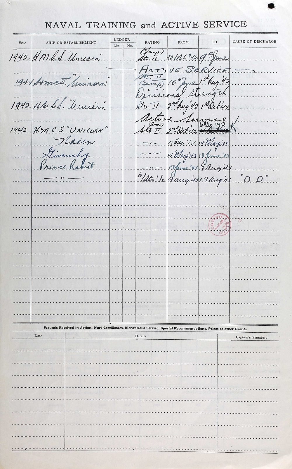 Ships served in: HMCS UNICORN - Enlisted 30 Mar 1942. Commenced active service 10 Jun 1942 HMCS GIVENCHY - Served in GIVENCHY 15 May 1943 - 18 Jun 1943 as a Sto 2c, RCNVR HMCS PRINCE ROBERT - Drafted to PRINCE ROBERT 19 Jun 1943 as a Sto 2c, RCNVR. Rated A/Sto 1c 09 Aug 1943.