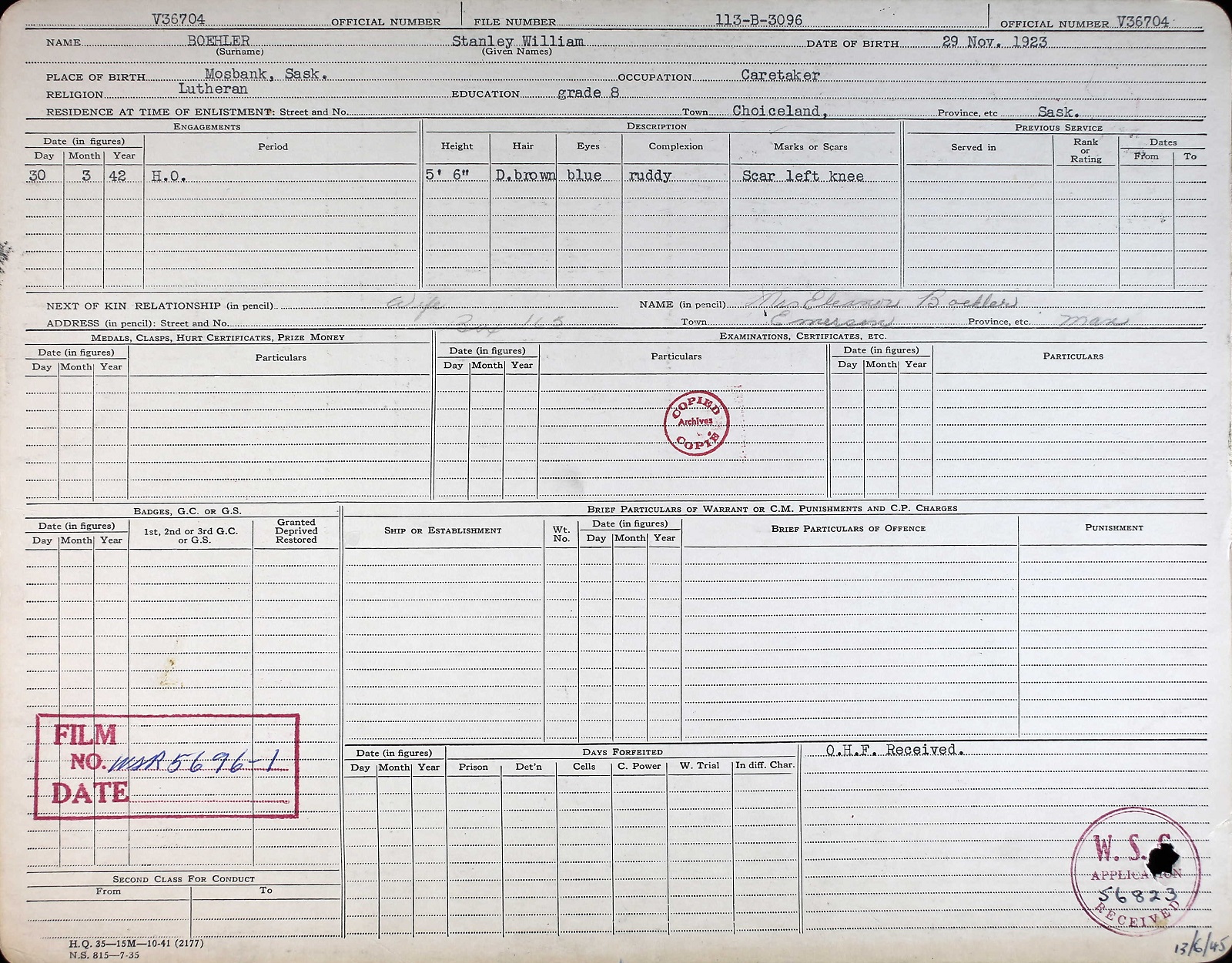 Stoker Stanley William Boehler took ill and died at sea on 17 Aug 1943 from peritonitis caused by perforated peptic ulcer. He died during surgery and was buried at sea the same day. Stoker Boehler was the son of Otto and Minnie (Mantei) Boehler who came to Meadow Lake from the Gretna Emerson area of Manitoba, later moving to Choiceland, Saskatchewan. Stanley left a wife Eleanor (Haig) at Montréal.
