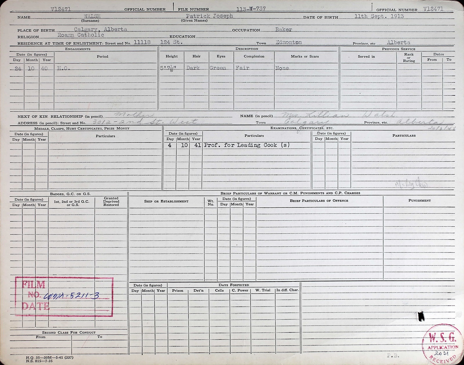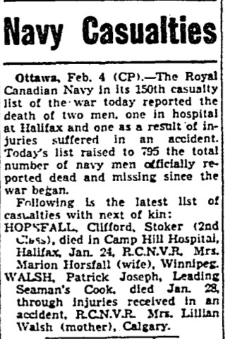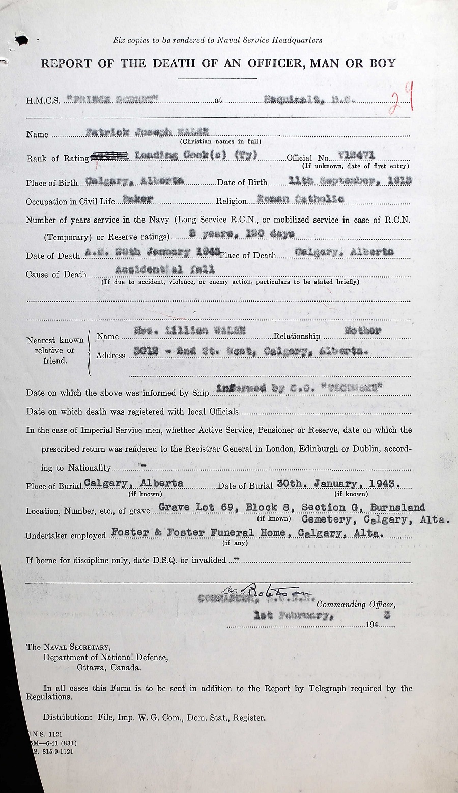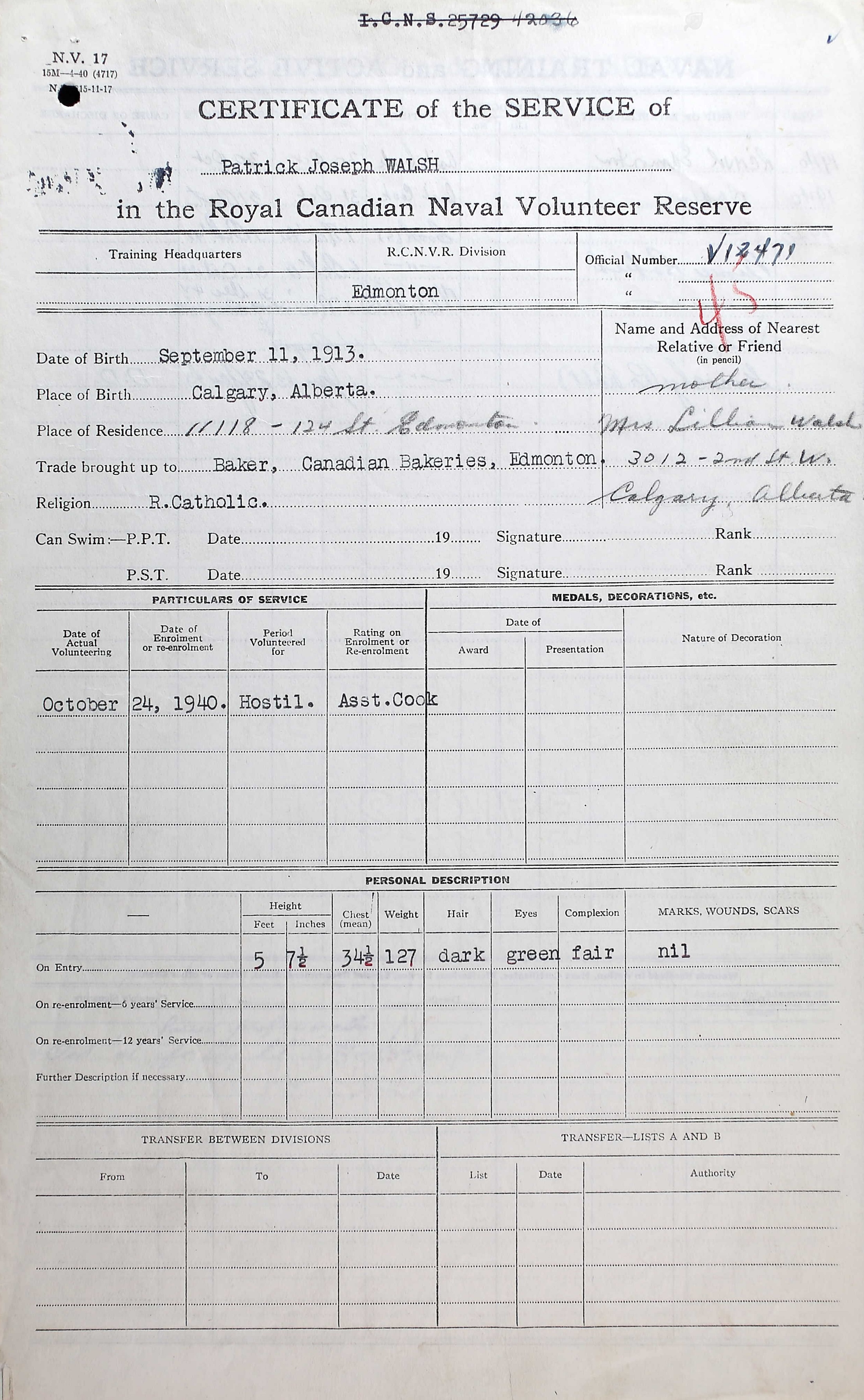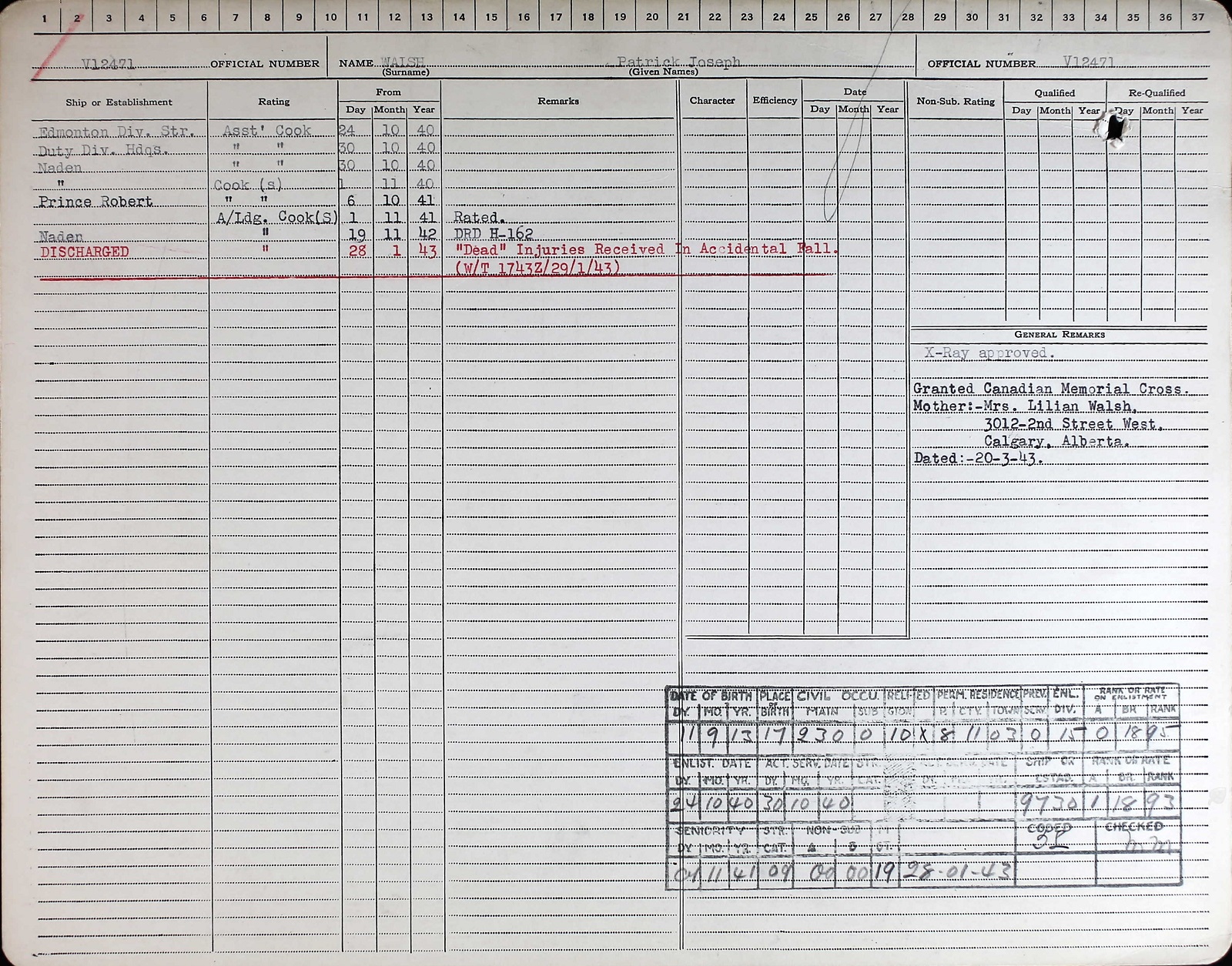 WALSH, Patrick Joseph, L/Ck (S), V12471, RCNVR, died - 28 Jan 1943, HMCS PRINCE ROBERT - son of Lillian Walsh, of Calgary.