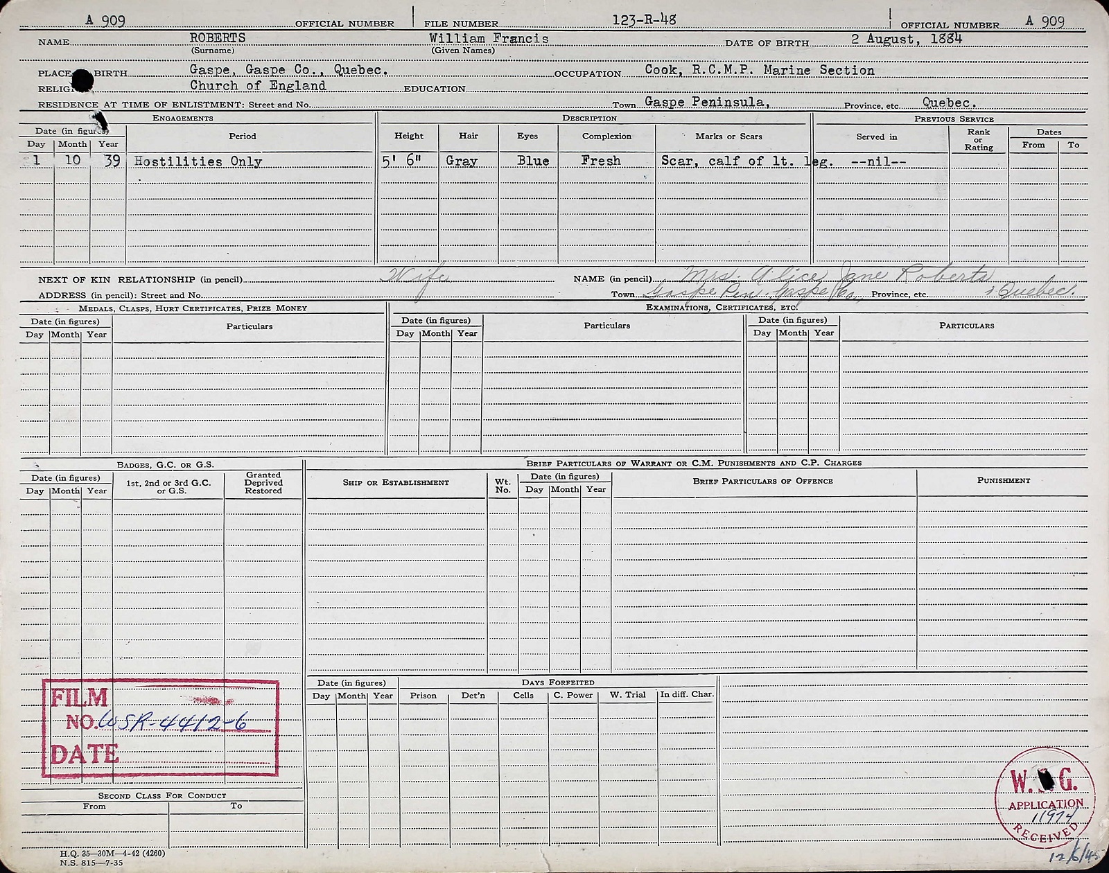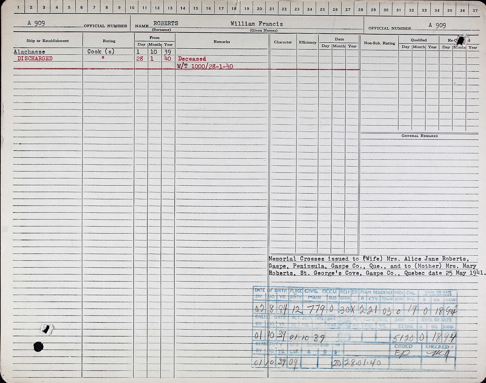 ROBERTS, William Francis, Ck (S), A909, RCNR, died - 28 Jan 1940, HMCS ALACHASSE - Husband of Alice Jane Roberts, of Peninsula-Gaspe.