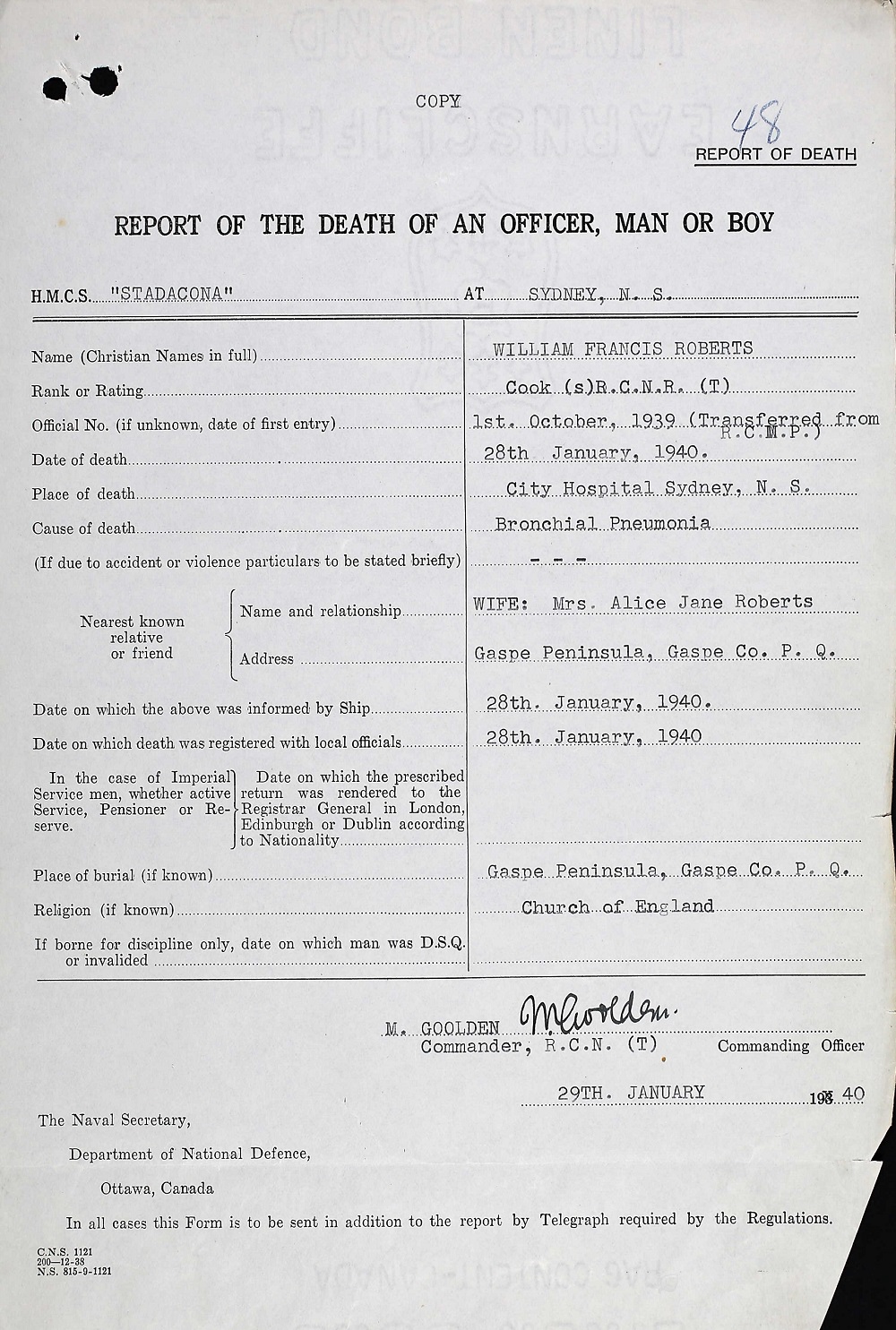 Ck William Roberts died at City Hospital, Sydney, NS from bronchial pneumonia. He is buried in the St. Matthew Anglican Cemetery, Gaspe Peninsula, Quebec