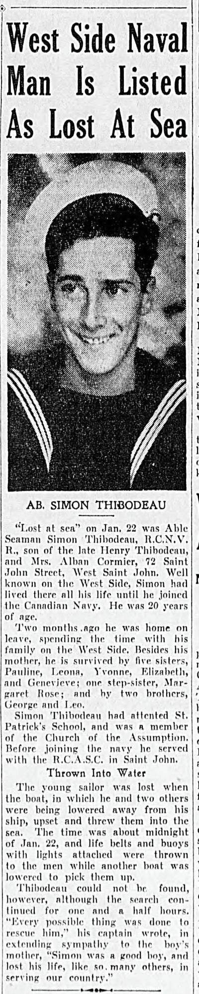 THIBODEAU, Simon Joseph, Ordinary Seaman, V2555, RCNVR, MPK - 22 Jan 1942, HMCS ANDRÉE DUPRÉ - Son of Henry Thibodeau, and of Gertrude Thibodeau, of Saint John, New Brunswick.