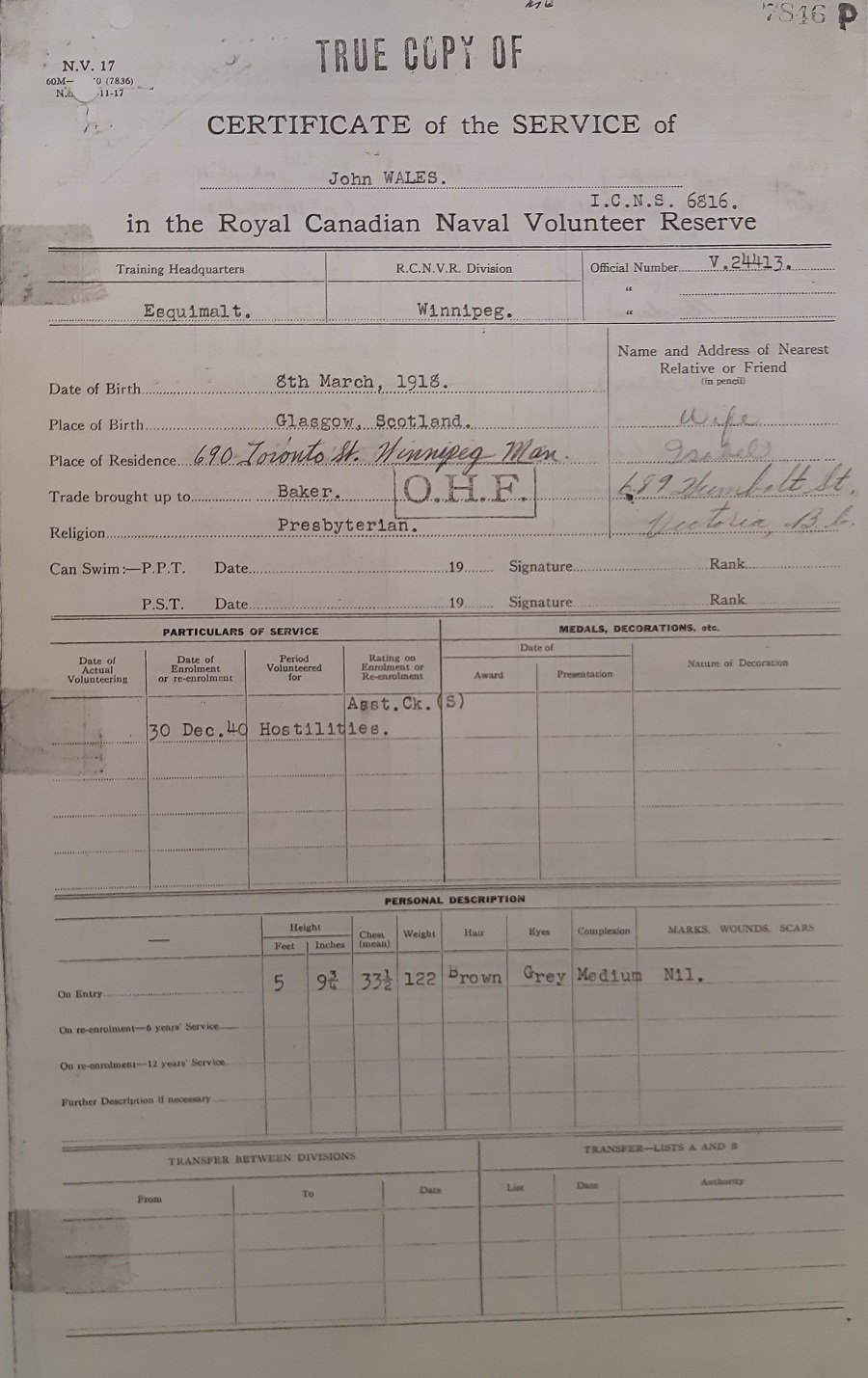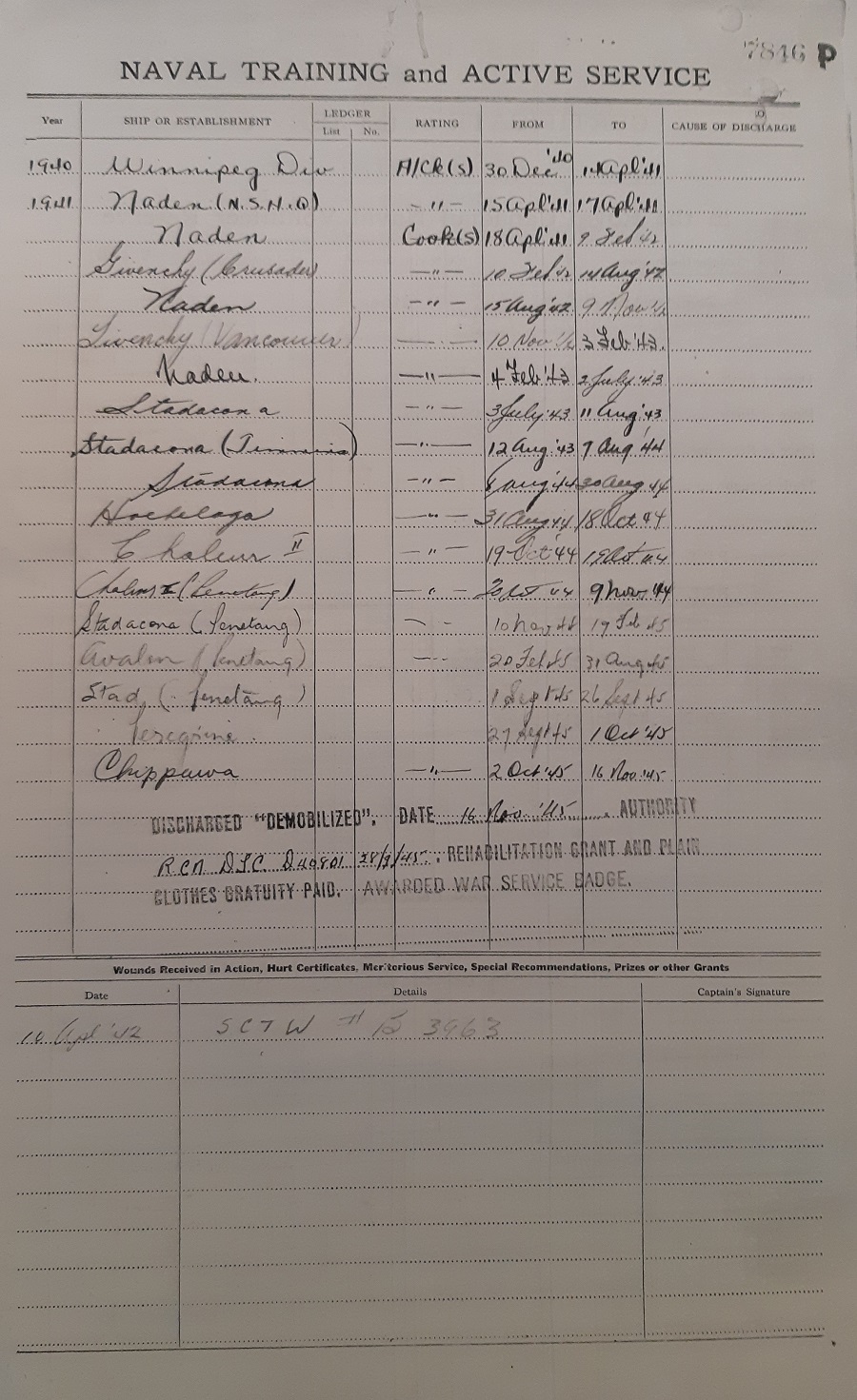 Ships served in: WINNIPEG DIVISION RCNVR - Enlisted 30 Dec 1944 as a A/Ck (S) HMCS CRUSADER - Served in Crusader 10 Feb 1942 - 14 Aug 1942 as a Ck (S), RCNVR HMCS VANCOUVER - Served in Vancouver 10 Nov 1942 - 03 Feb 1943 as a Ck (S), RCNVR HMCS TIMMINS - Served in Timmins 12 Aug 1943 - 09 Aug 1944 as a Ck (S), RCNVR HMCS PENETANG - Served in Penetang 20 Oct 1944 - 26 Sep 1945 as a Ck (S), RCNVR. Commissioning crew HMCS CHIPPAWA - Demobilized 16 Nov 1945