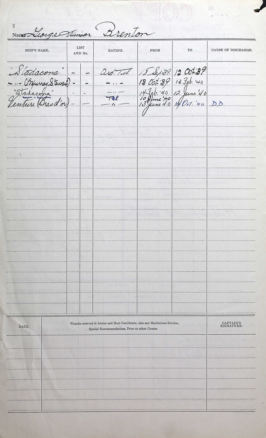 Ships served in: HMCS MURRAY STEWART - Served in Murray Stewart 13 Oct 1939 - 31 Dec 1939 as an O/Tel, RCNVR HMCS BRAS D'OR - Drafted to Bras D'Or 13 Jun 1940 as a Tel, RCNVR