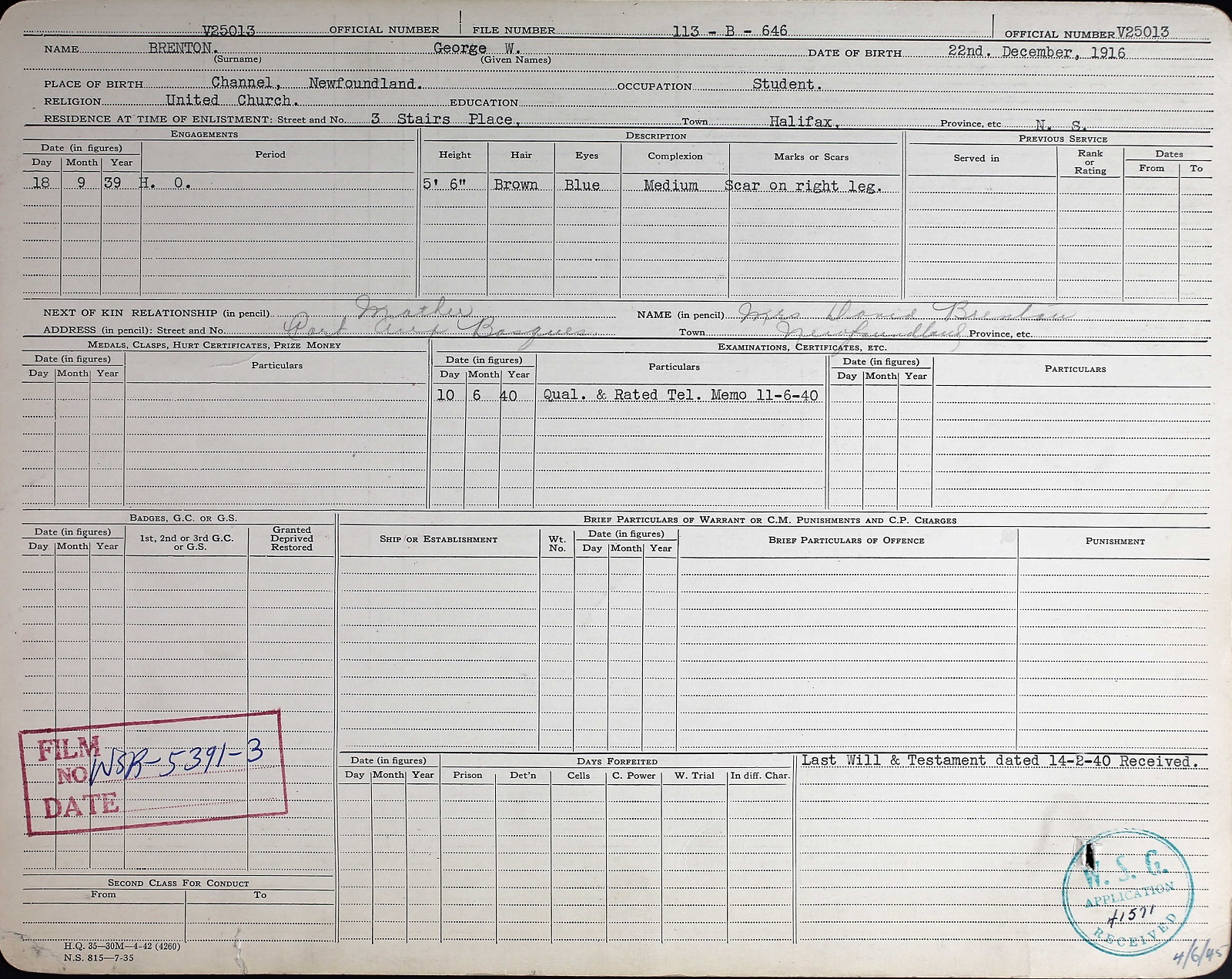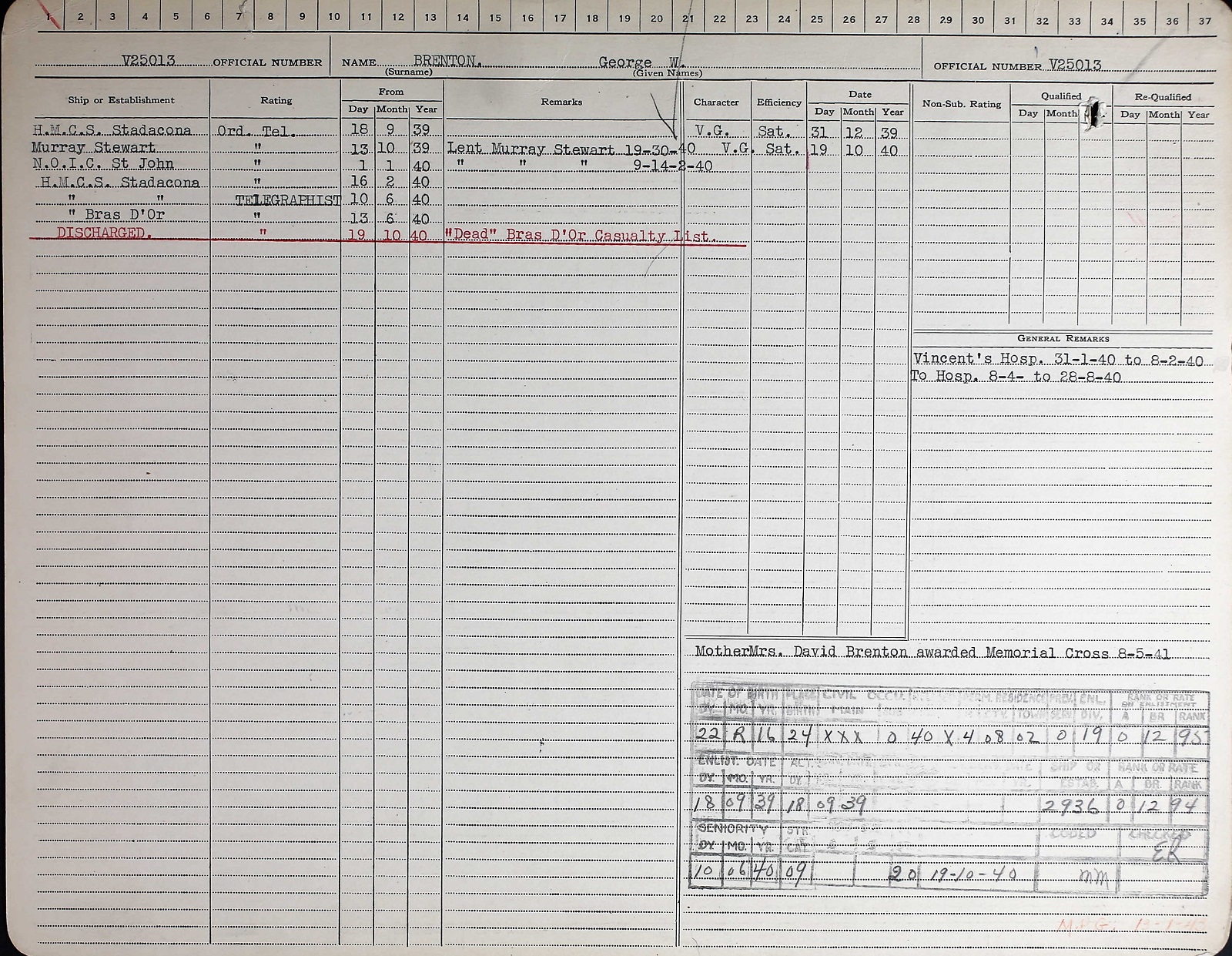 BRENTON, George Winsor, Telegraphist, V25013, RCNVR, MPK - 19 Oct 1940, HMCS BRAS D'OR - son of Captain David Brenton and Mary Julia Brenton, of Port aux Basques, Newfoundland.