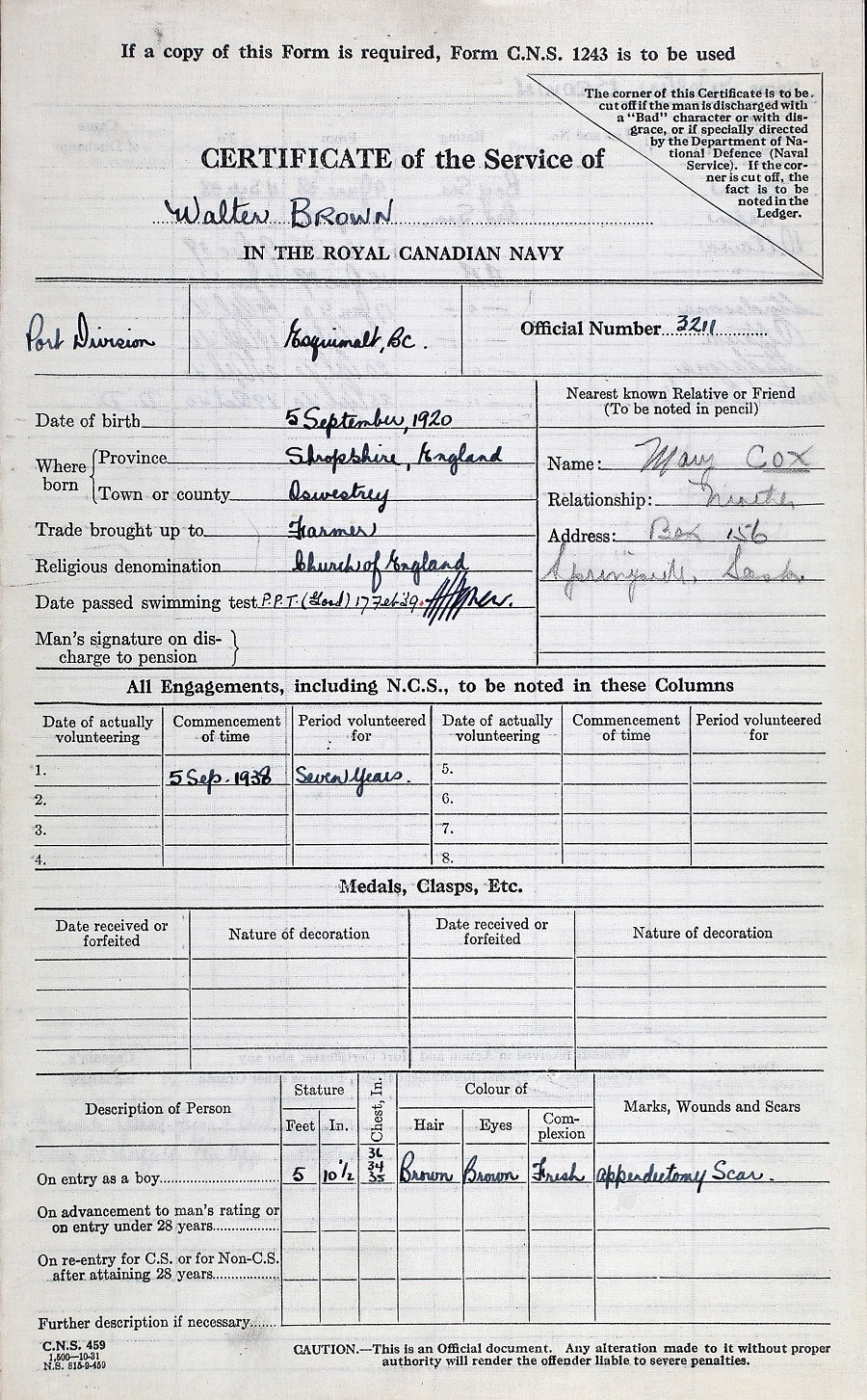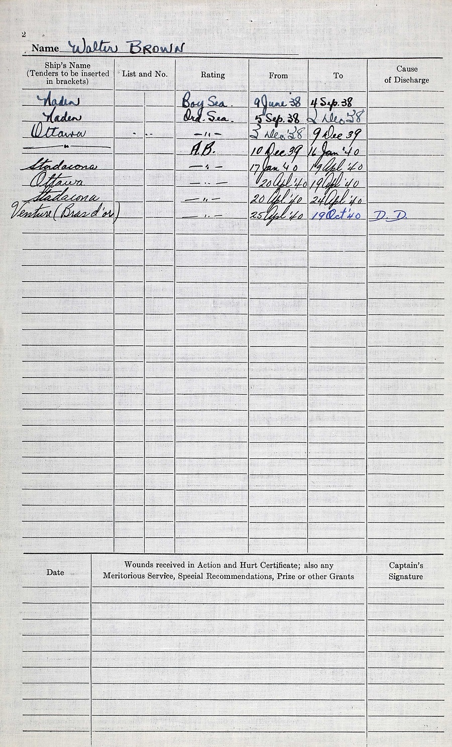 Ships served in: HMCS OTTAWA - Served in Ottawa 03 Dec 1938 - 15 Jan 1940 as an OS & AB, RCN. Rated AB 10 Dec 1939 HMCS BRAS D'OR - Drafted to Brad D'Or 25 Apr 1940 as an AB, RCN