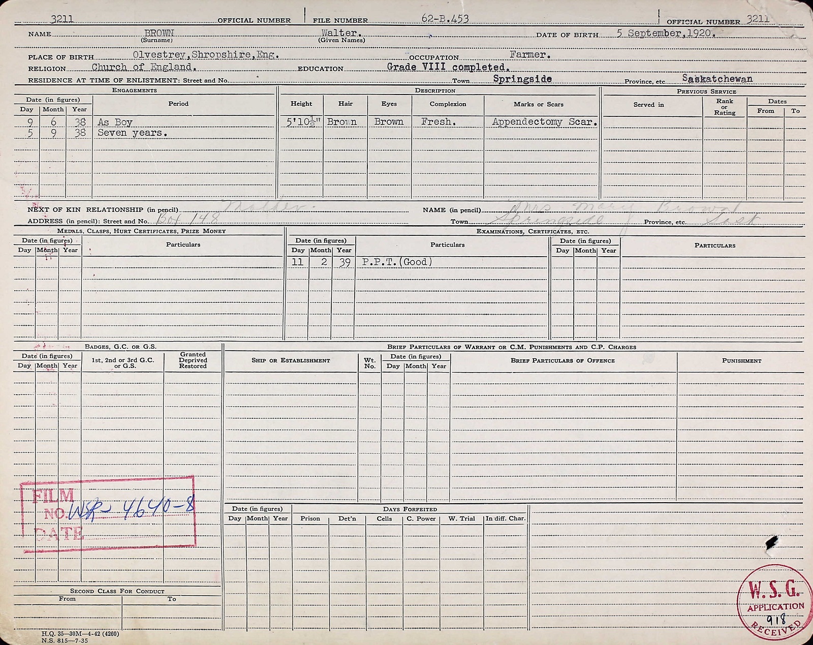 Walter James (Dicky) Brown was born September 05, 1920 at Oswestry, Shropshire, England, and came to Canada with his father Fred Brown (a WWI veteran) to a farm just north of Springside at the age of six (his mother Mary died of tuberculosis when he was just three). He farmed before enlisting on June 09, 1938 as a boy seaman at Esquimalt, British Columbia, and was the Yorkton area's first casualty of the war. His father Fred later moved to Oakville, Ontario. The Bras d'Or was an auxiliary minesweeper completed at Sorel, Québec, in 1926 as a lightship. On the outbreak of war she patrolled the approaches to Halifax and the Gulf of St. Lawrence. In October 1940 while shadowing a Romanian freighter she disappeared without a trace between Anticosti Island and Sydney.