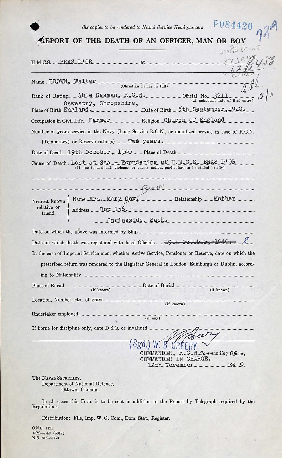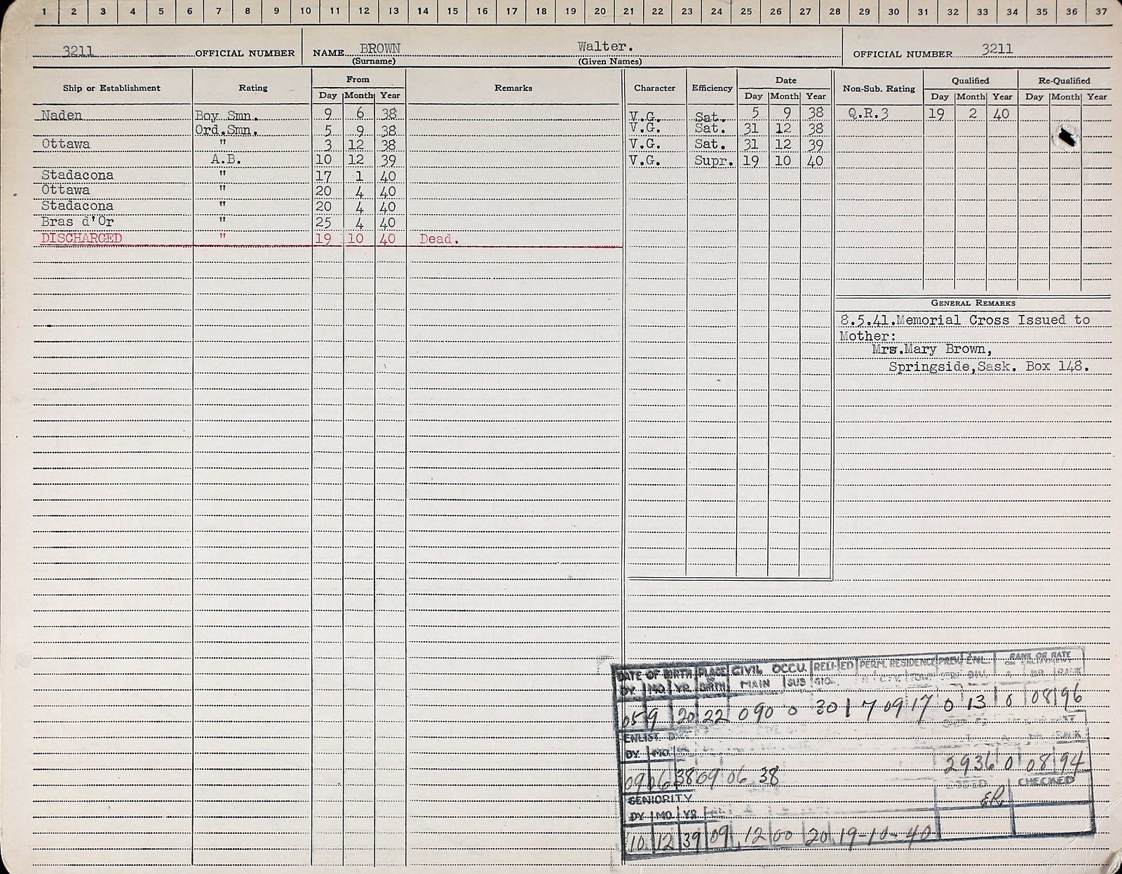 BROWN, Walter James (Dicky), AB, 3211, RCN, MPK - 19 Oct 1940, HMCS BRAS D'OR - son of Fred and Mary Brown, of Oakville, OnN.