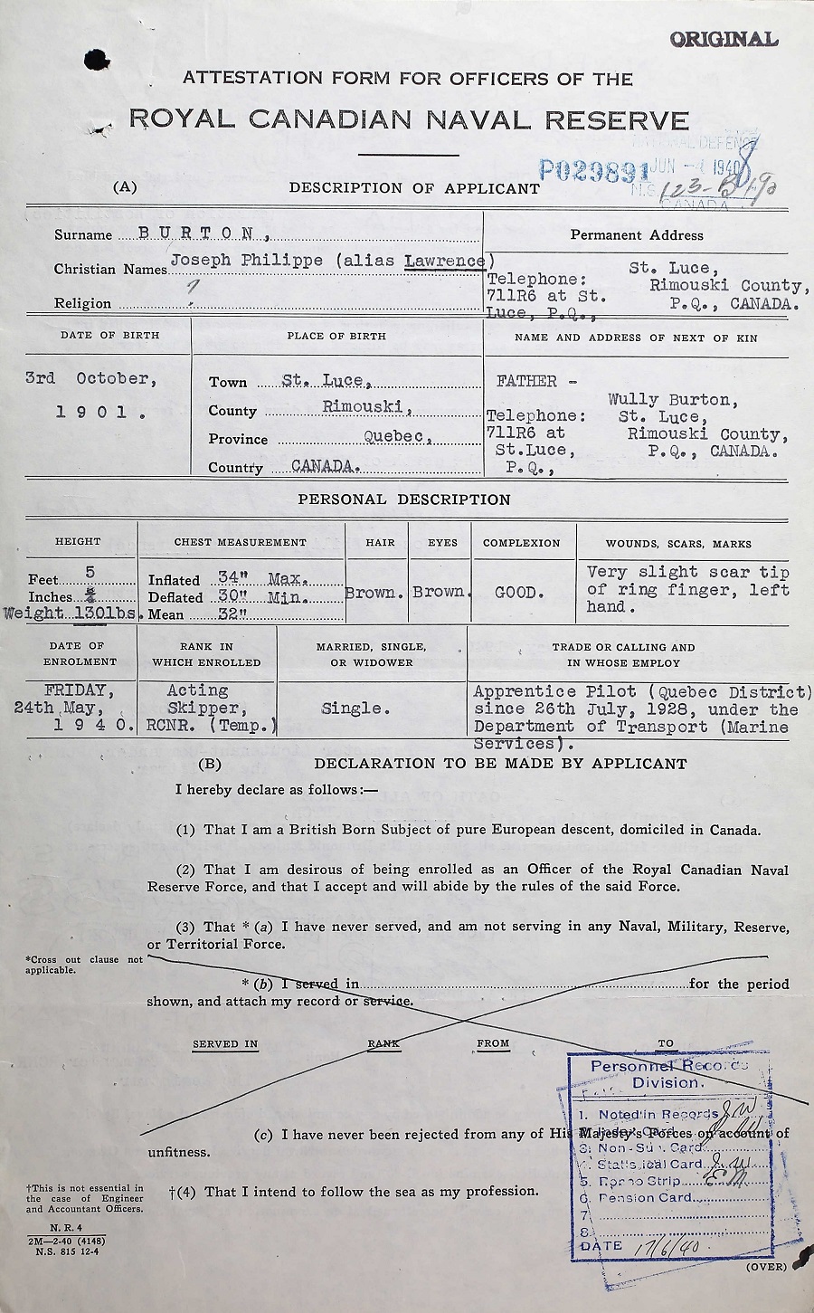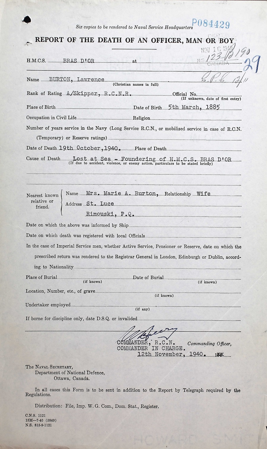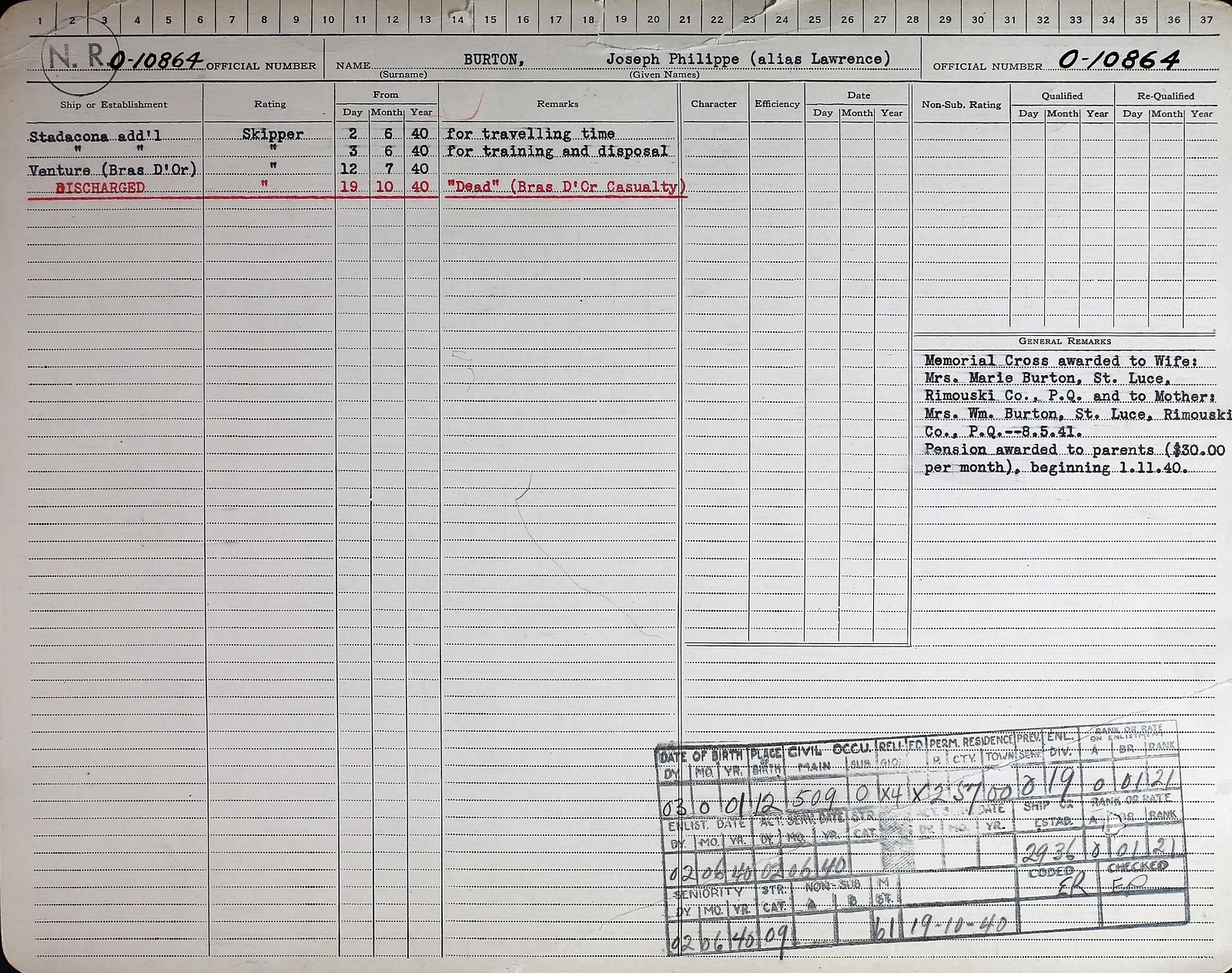 BURTON, Joseph Philippe (aka Lawrence), Skipper, O-10864, RCNR MPK - 19 Oct 1940, HMCS BRAS D'OR - son of William and Maria Burton; husband of Marie A. Burton, all of Ste. Luce, QC.