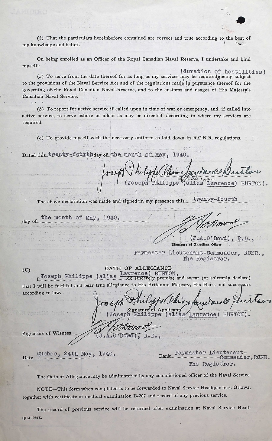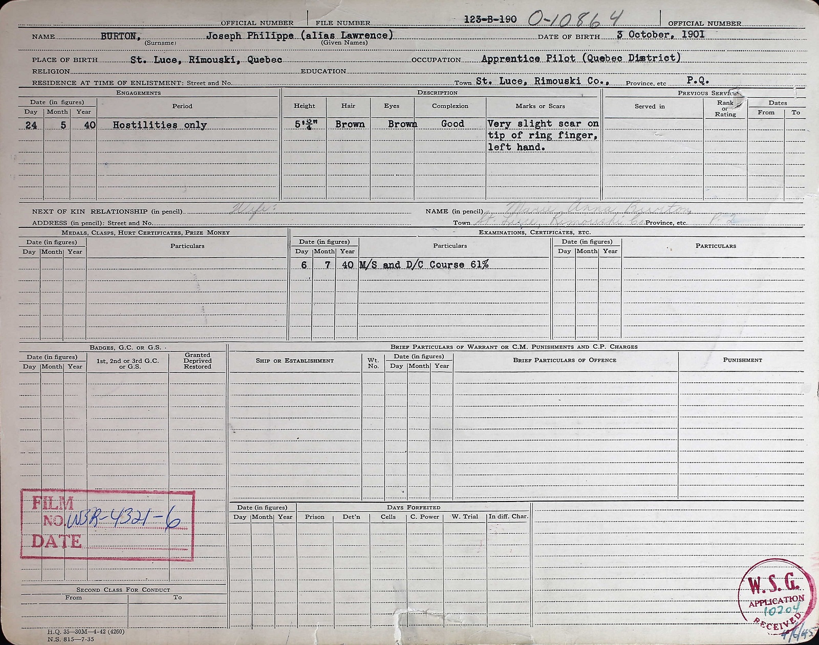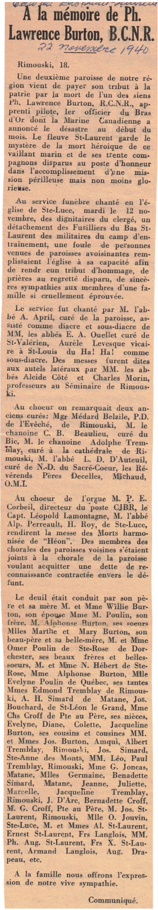 BURTON, Joseph Philippe (aka Lawrence), Skipper, O-10864, RCNR MPK - 19 Oct 1940, HMCS BRAS D'OR - son of William and Maria Burton; husband of Marie A. Burton, all of Ste. Luce, QC.