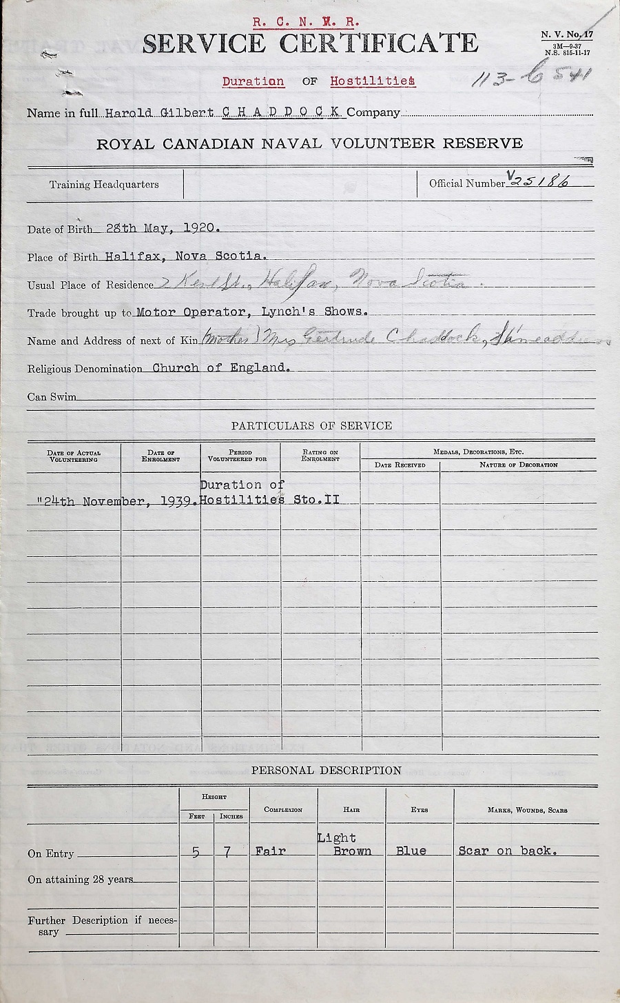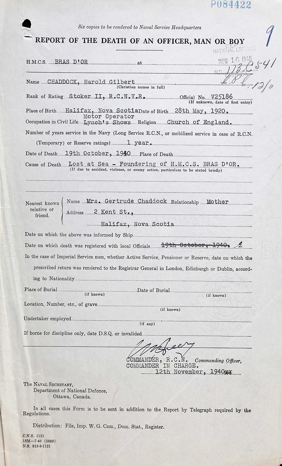 CHADDOCK, Harold Gilbert, Stoker 2c, V25186, RCNVR, MPK - 19 Oct 1940, HMCS BRAS D'OR - son of Philip Horatio and Alfreda Gertrude (née DeLouche) Chaddock, of Halifax, NS.
