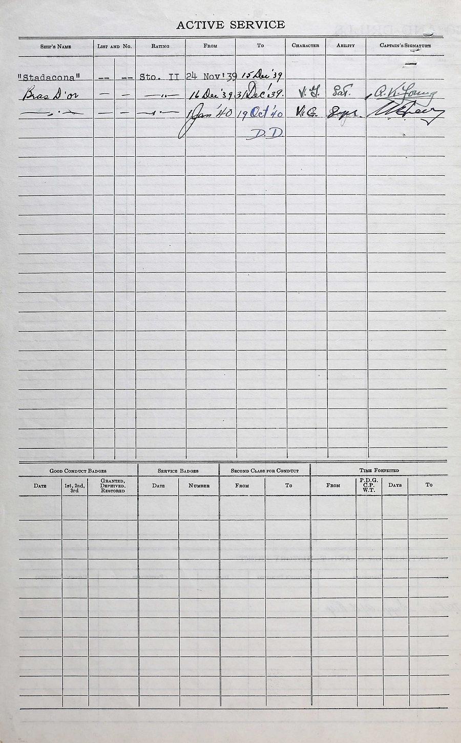 Ships served in: HMCS BRAS D'OR - Drafted to Bras D'Or 16 Dec 1939 at a Sto 2c, RCNVR