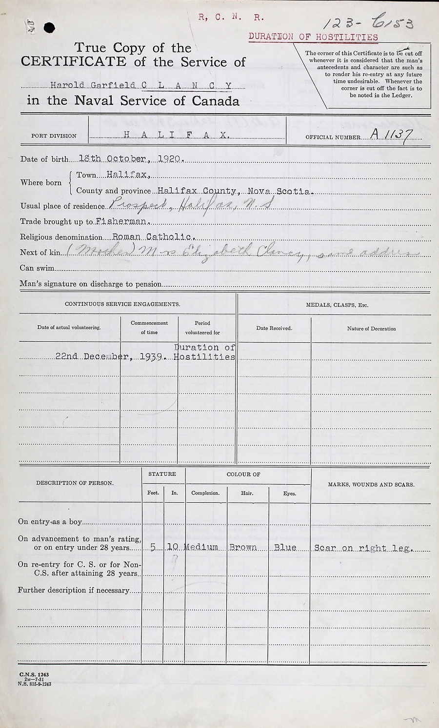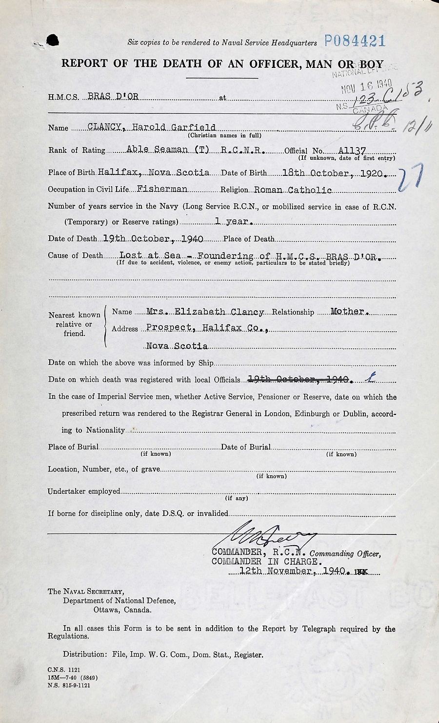CLANCY, Harold Garfield, AB, A1137, RCNR, MPK - 19 Oct 1940, HMCS BRAS D'OR - son of John William and Mary Elizabeth Clancy, of Prospect, NS.