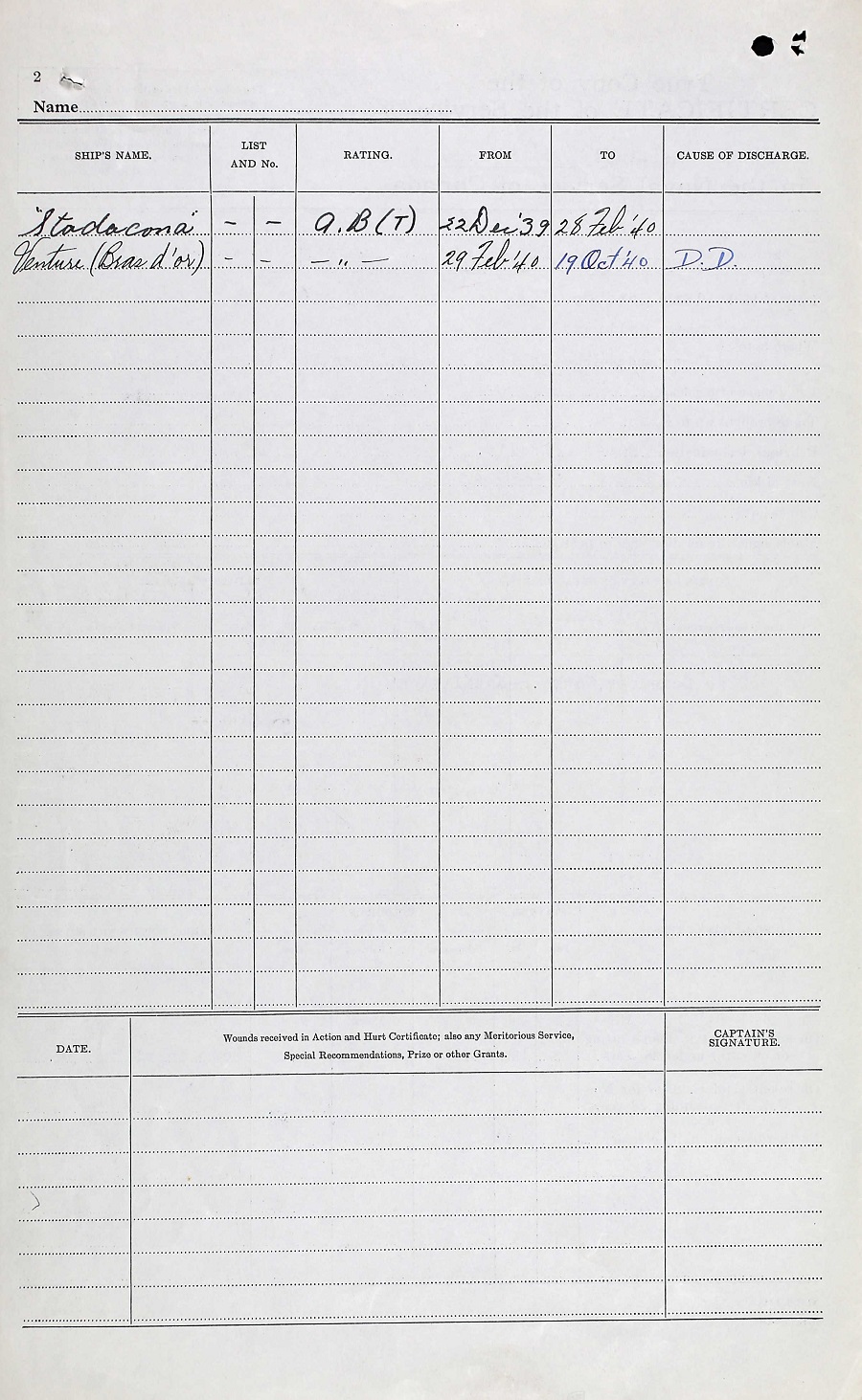Ships served in: HMCS BRAS D'OR - Drafted to Bras D'Or 29 Feb 1940 as an AB, RCNR
