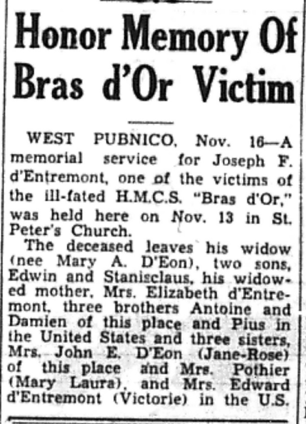 Honor Memory of Bras d'Or Victim West Pubnico, Nov. 16 - A memorial Service for Joseph F. d'Entremont, one of the victims of the ill-fated HMCS Bras d'Or, was held here on Nov. 13 in St. Peter's Church The deceased leaves his widow, (nee Mary A. D'Eon), two sons, Edwin and Stanisclaus, his widowed mother, Mrs. Elizabeth d'Entremont, three brothers Antoine and Damien of this place and Pius in the United States and three sisters, Mrs. John E. D'Eon (Jane-rose) of this place and Mrs. Pothier (Mary Laura), and Mrs. Edward d'Entremont (Victorie) in the US. (Halifax Chronicle, Mon., 18 Nov 1940 / Researched by George Newbury)