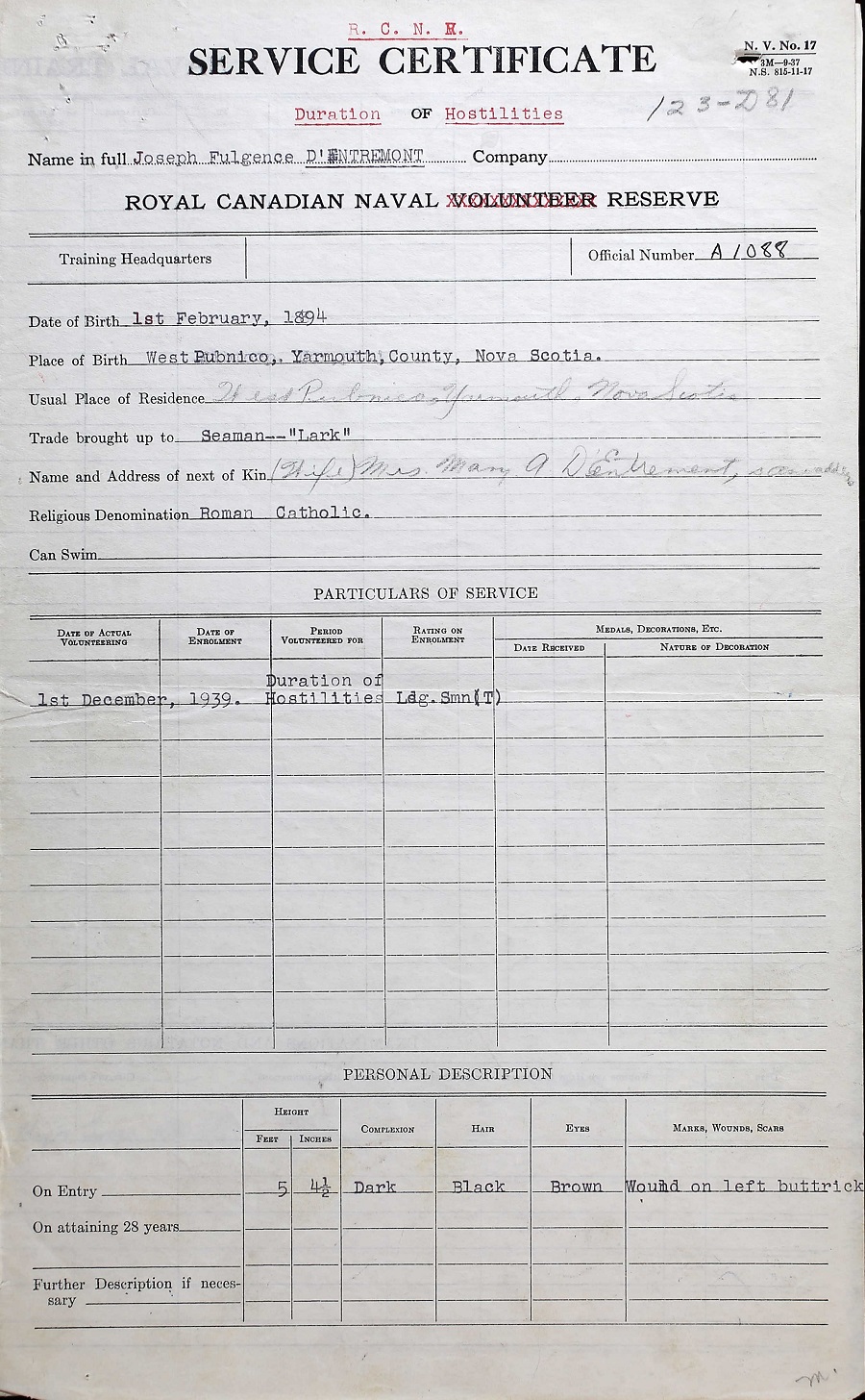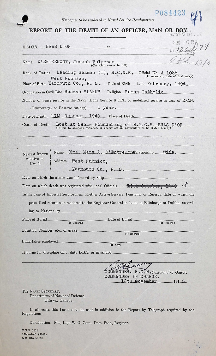 D'ENTREMONT, Joseph Fulgence, LS, A1088, RCNR, MPK - 19 Oct 1940, HMCS BRAS D'OR - son of Elizabeth M. d'Entremont and the late Fulgence d'Entremont; husband of Mary Adelle d'Entremont; father of Edwin and Stanisclaus, all of West Pubnico, NS.