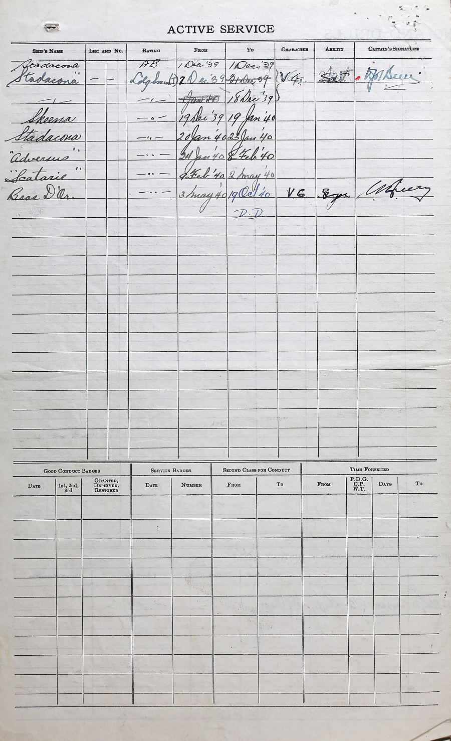Ships served in: HMCS SKEENA - Served in SKEENA 19 Dec 1939 - 19 Jan 1940 as a LS, RCNR HMCS ADVERSUS - Served in ADVERSUS 24 Jan 1940 - 08 Feb 1940 as a LS, RCNR HMCS SCATARIE - Served in SCATERIE - 03 May 1940 - 02 May 1940 as a LS, RCNR HMCS BRAS D'OR - Drafted to BRAD D'OR 03 May 1940 as a LS, RCNR