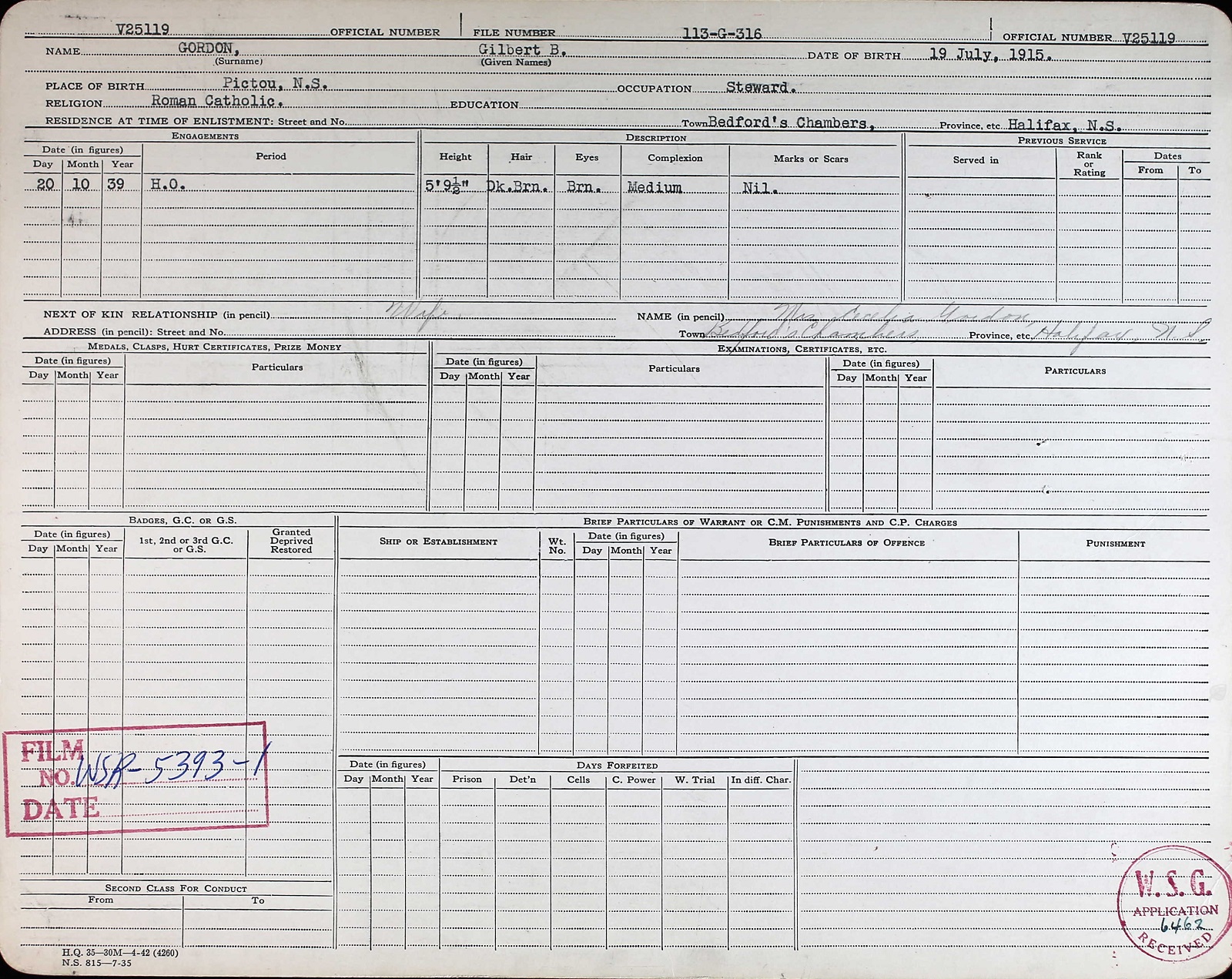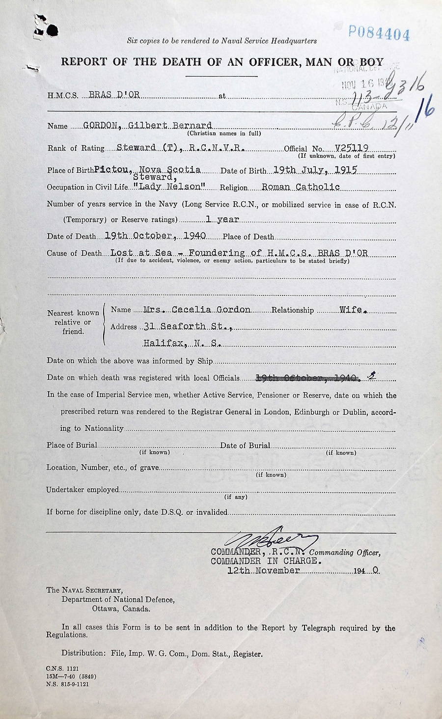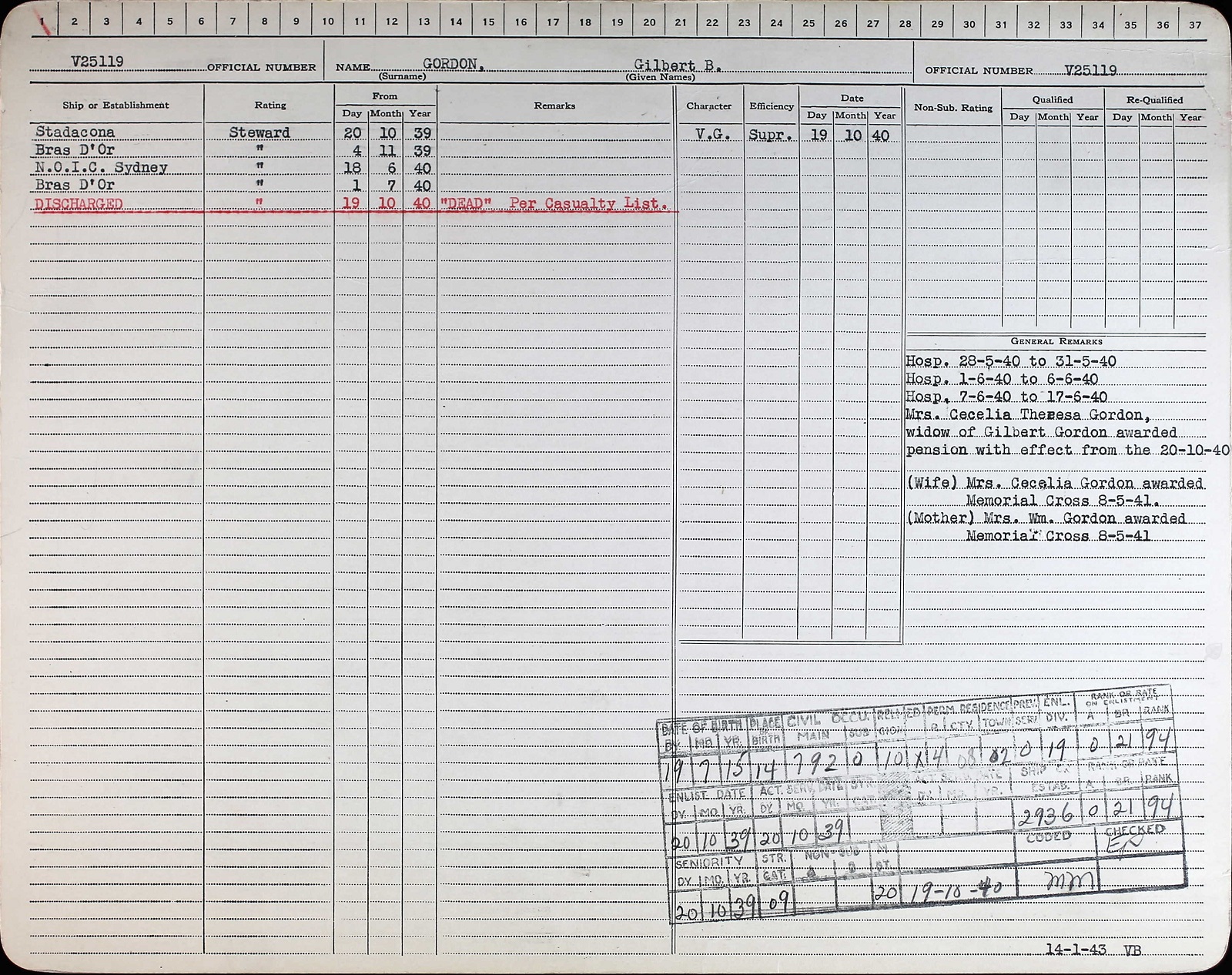 GORDON, Gilbert Bernard, Steward, V25119, RCNVR, MPK - 19 Oct 1940, HMCS BRAS D'OR - son of William G. and Mary Gordon; husband of Cecilia Gordon, all of Halifax, NS.