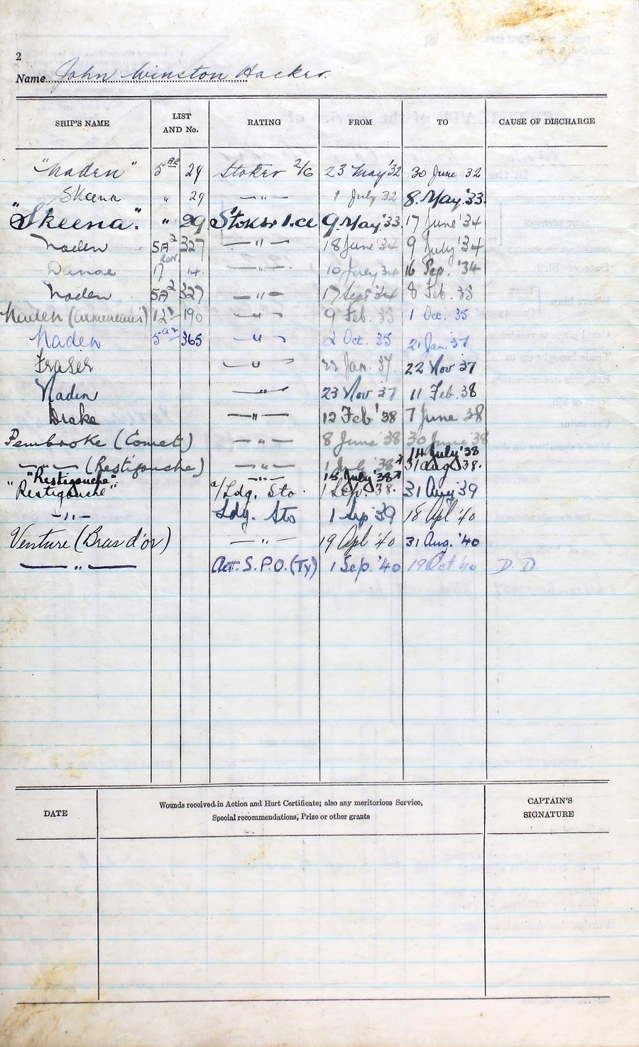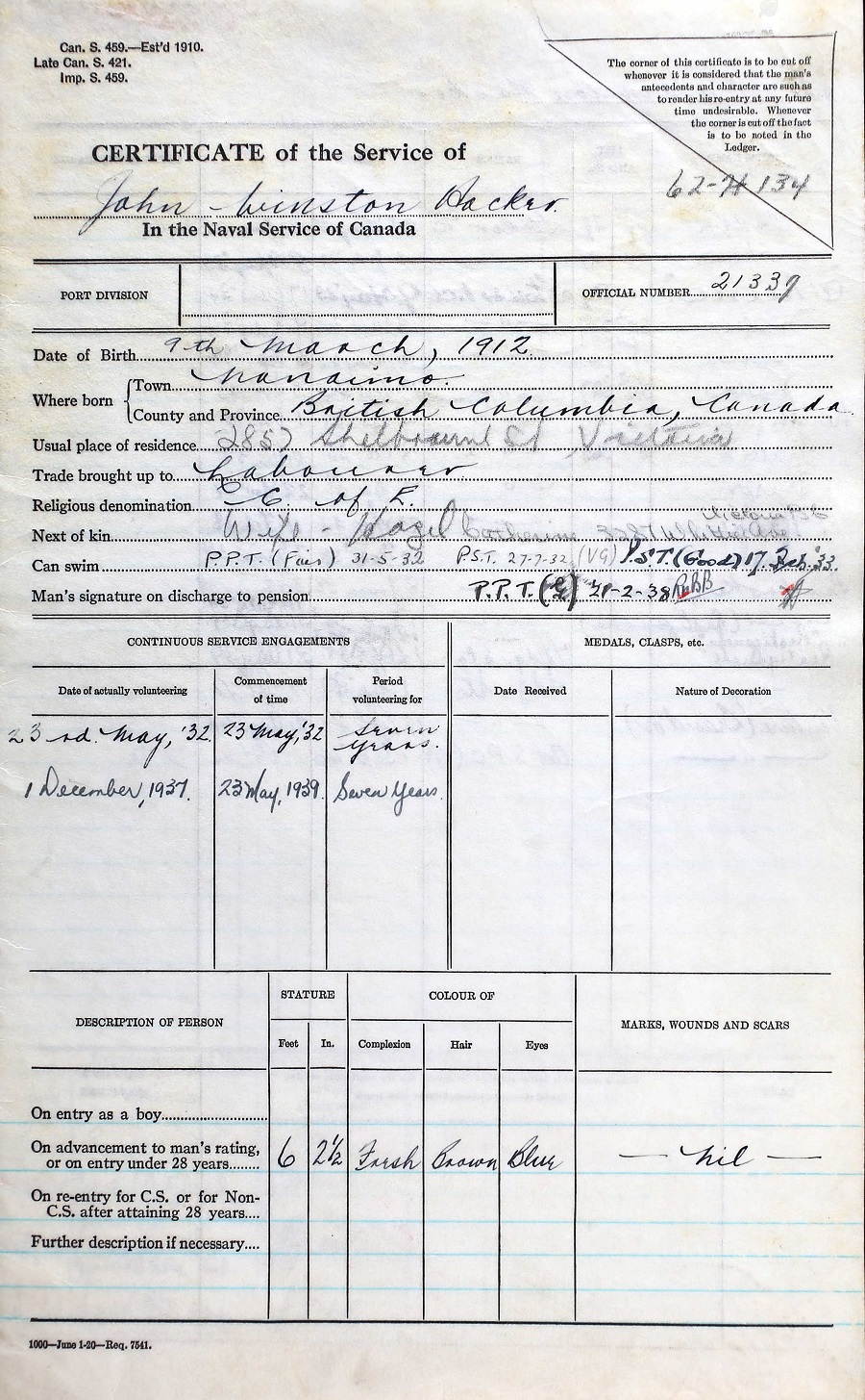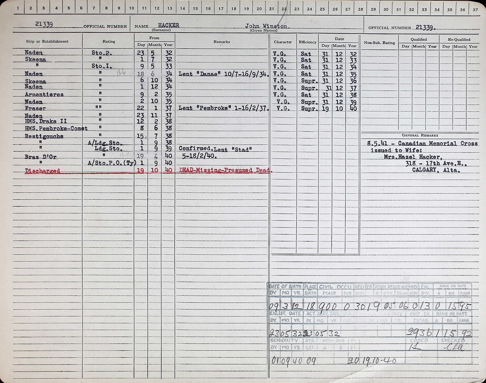 Ships served in: HMCS SKEENA - Served in Skeena 01 Jul 1932 - 17 Jun 1934 as a Sto 2c and Sto 1c, RCN. Rated Sto 1c 09 May 1933. HMS DANAE - Served in Danae 10 Jul 1934 - 16 Sep 1934 (lent from HMCS Naden) HMCS SKEENA - Served in Skeena 06 Oct 1934 - 30 Nov 1934 as a Sto 1c, RCN HMCS ARMENTIERES - Served in Armentieres 09 Feb 1935 - 01 Oct 1935 HMCS FRASER - Served in Fraser 22 Jan 1937 - 22 Nov 1937 HMS PEMBROKE (RN shore station) - Served in Pembroke 01 Feb 1937 - 16 Feb 1937 (lent from HMCS FRASER) HMS COMET - Served in Comet 08 Jun 1938 - 30 Jun 1938 pending her transfer to the RCN as HMCS Restigouche on 15 Jun 1938. HMCS RESTIGOUCHE (former HMS Comet) - Served in Restigouche 01 Jul 1938 - 18 Apr 1940 as a Sto 2c and L/Sto, RCN. Rated L/Sto 01 Sep 1939 HMCS BRAS D'OR - Drafted to Bras D'Or 19 Apr 1940 as a L/Sto RCN. Rated A/Sto PO 01 Sep 1940