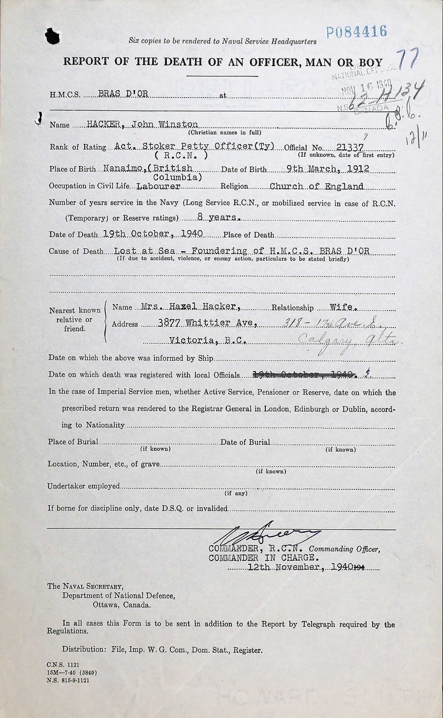 HACKER, John Winston, Sto PO, 21339, RCN, MPK - 19 Oct 1940, HMCS BRAS D'OR - son of Mr. and Mrs. William John Hacker, of Nanaimo, BC; husband of Hazel Catherine Hacker, of Calgary, AB.