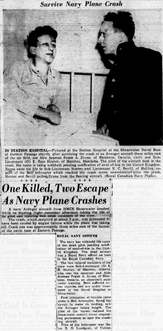 AB Zruna survived the crash of an Avenger aircraft near Shearwater, NS on 25 Jan 1954. SLt Hunter also survived. The pilot, who was a RN officer, died in the crash.