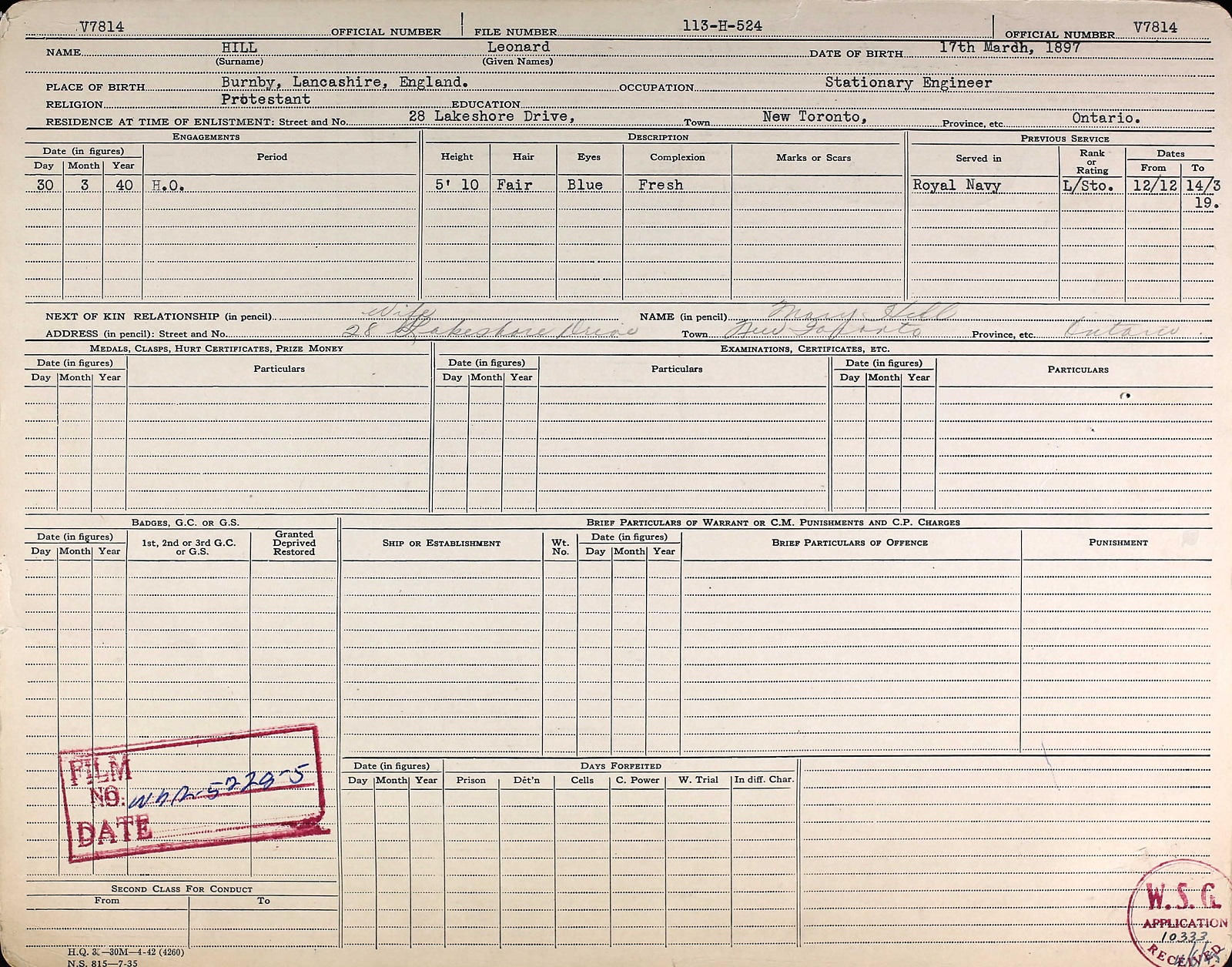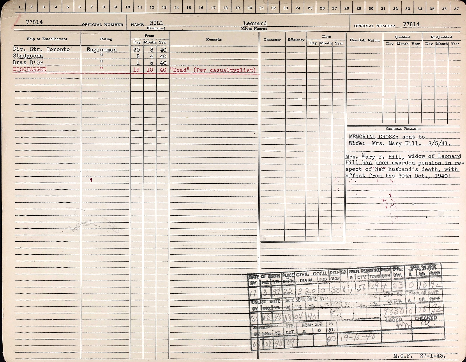 HILL, Leonard, Engineman, V7814, RCNVR, MPK - 19 Oct 1940, HMCS BRAS D'OR - son of John and Helena Hill; husband of Mary Hill, of New Toronto, ON.